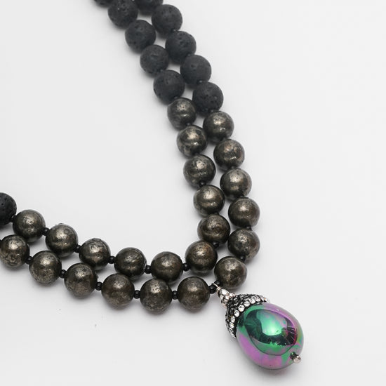Make a bold and elegant statement with the Black Lava Stone & Pyrite Layered Necklace from Basraa’s Luxe Collection. This handcrafted piece combines raw black lava stones and shimmering metallic beads, finished with a captivating iridescent pearl pendant that reflects shades of deep green and violet. The double-strand design offers depth and sophistication — a true fusion of natural energy and modern luxury.