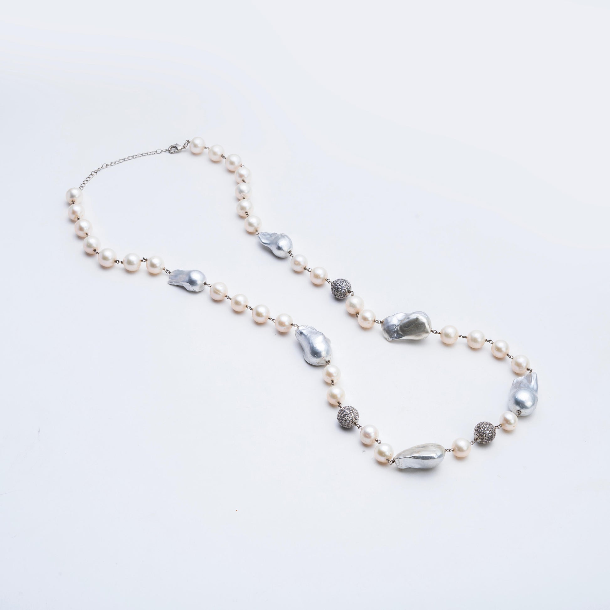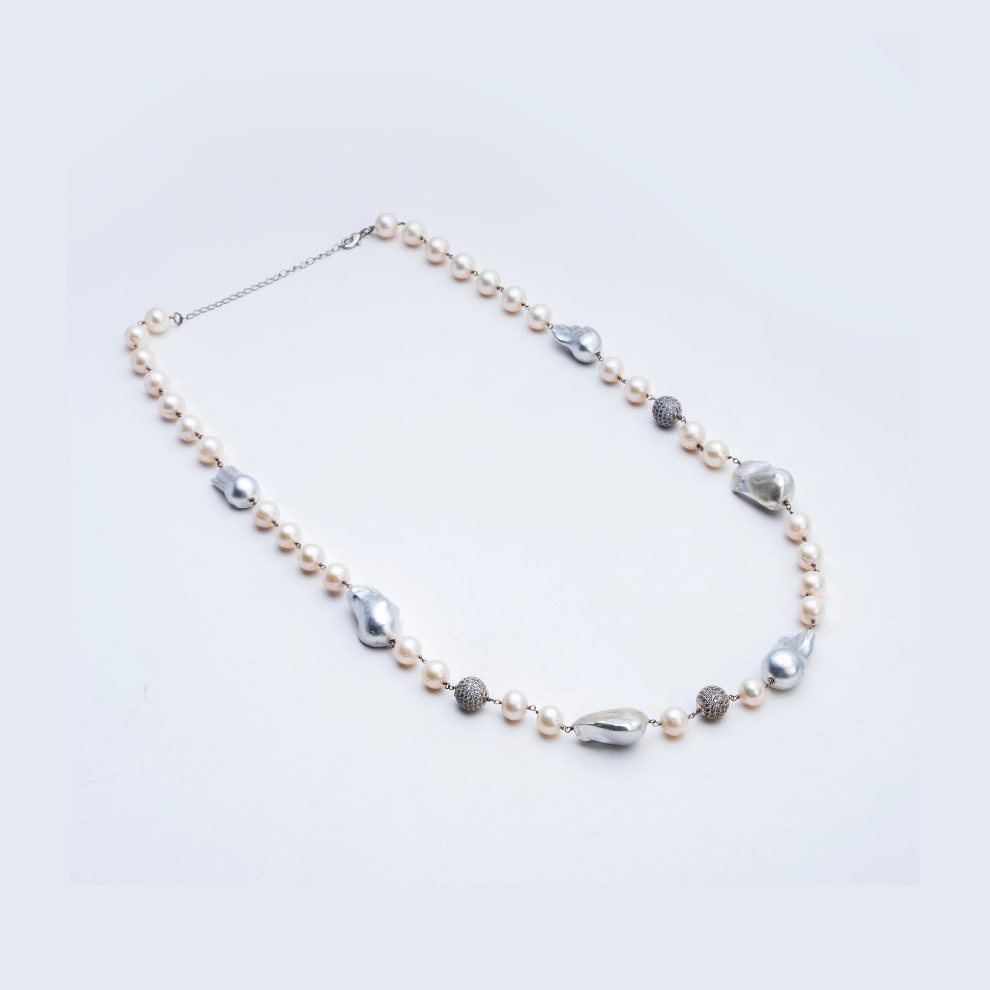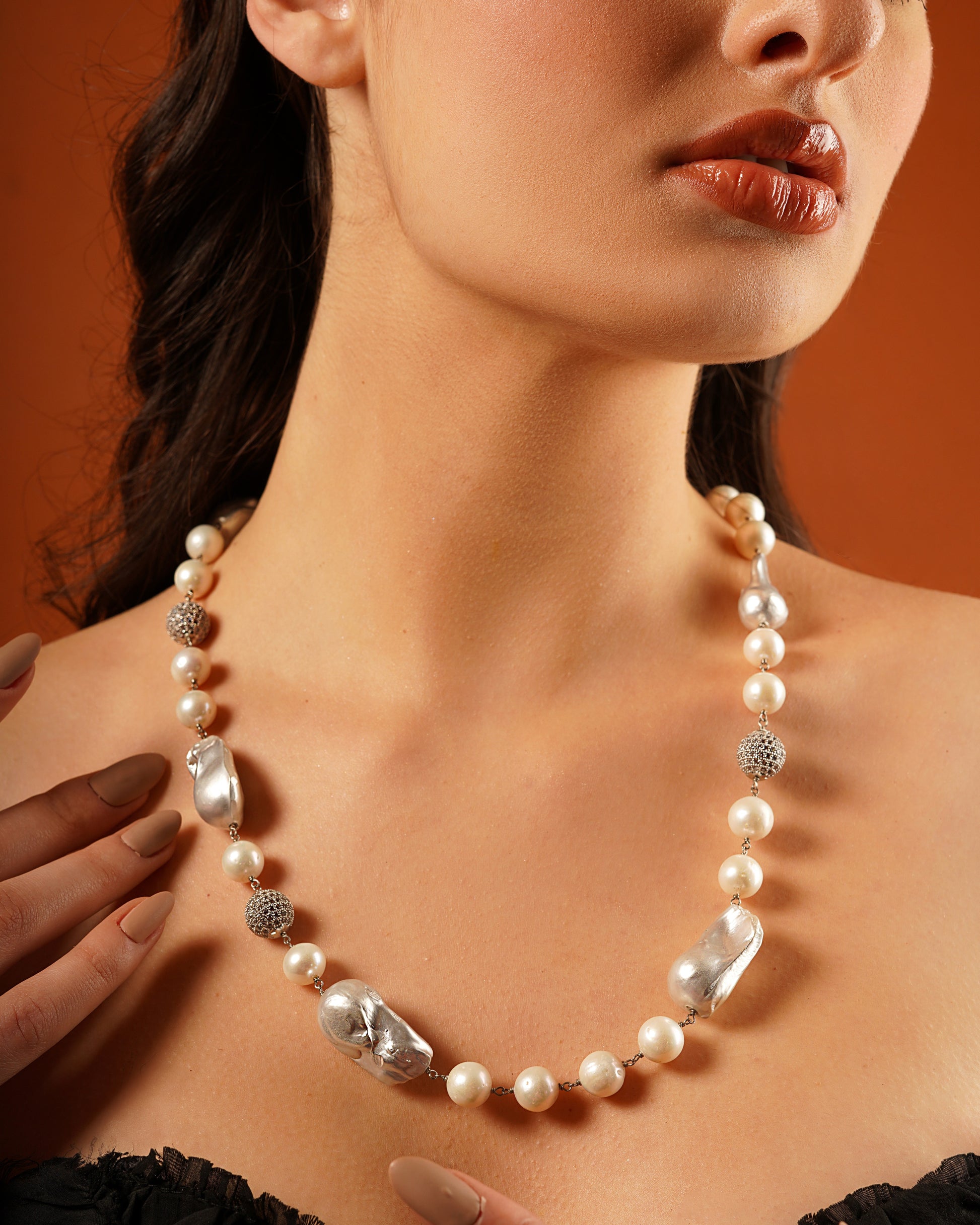 Elevate your elegance with the Aurora Pearl Symphony Necklace, an exquisite handcrafted piece from our Maris Pearl Collection. Featuring lustrous freshwater pearls paired with uniquely sculpted baroque pearls, this necklace is a harmonious blend of timeless sophistication and modern artistry. The intricate silver accents with dazzling embellishments add a touch of luxury, making it perfect for both formal and special occasions.