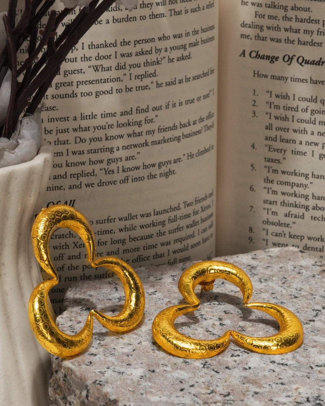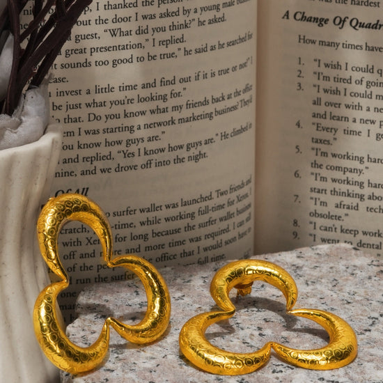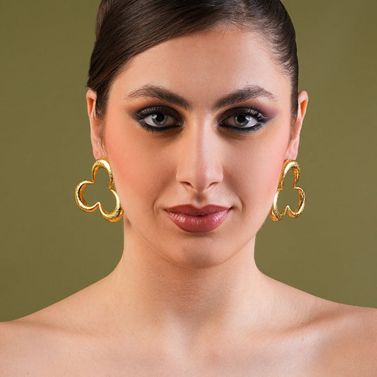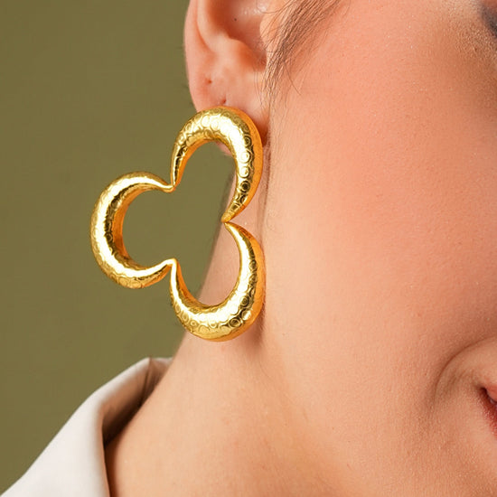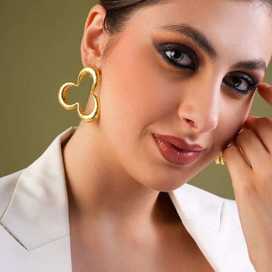 Bold, sculptural, and unapologetically striking — these statement earrings redefine modern glamour. Crafted from premium quality brass alloy and finished in radiant gold, the Aurum Clover Hoops feature a unique quatrefoil-inspired silhouette with subtle etched detailing. Lightweight yet impactful, they are perfect for turning heads at festive occasions, cocktail nights, or a power-packed day at work.