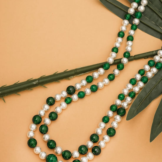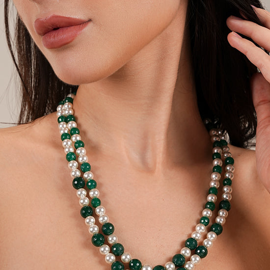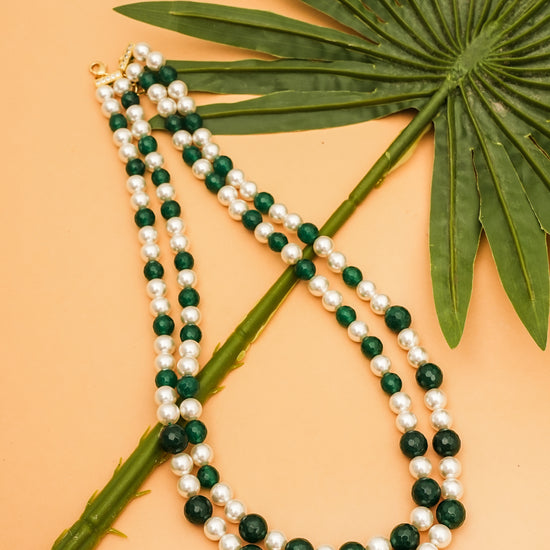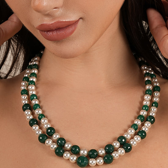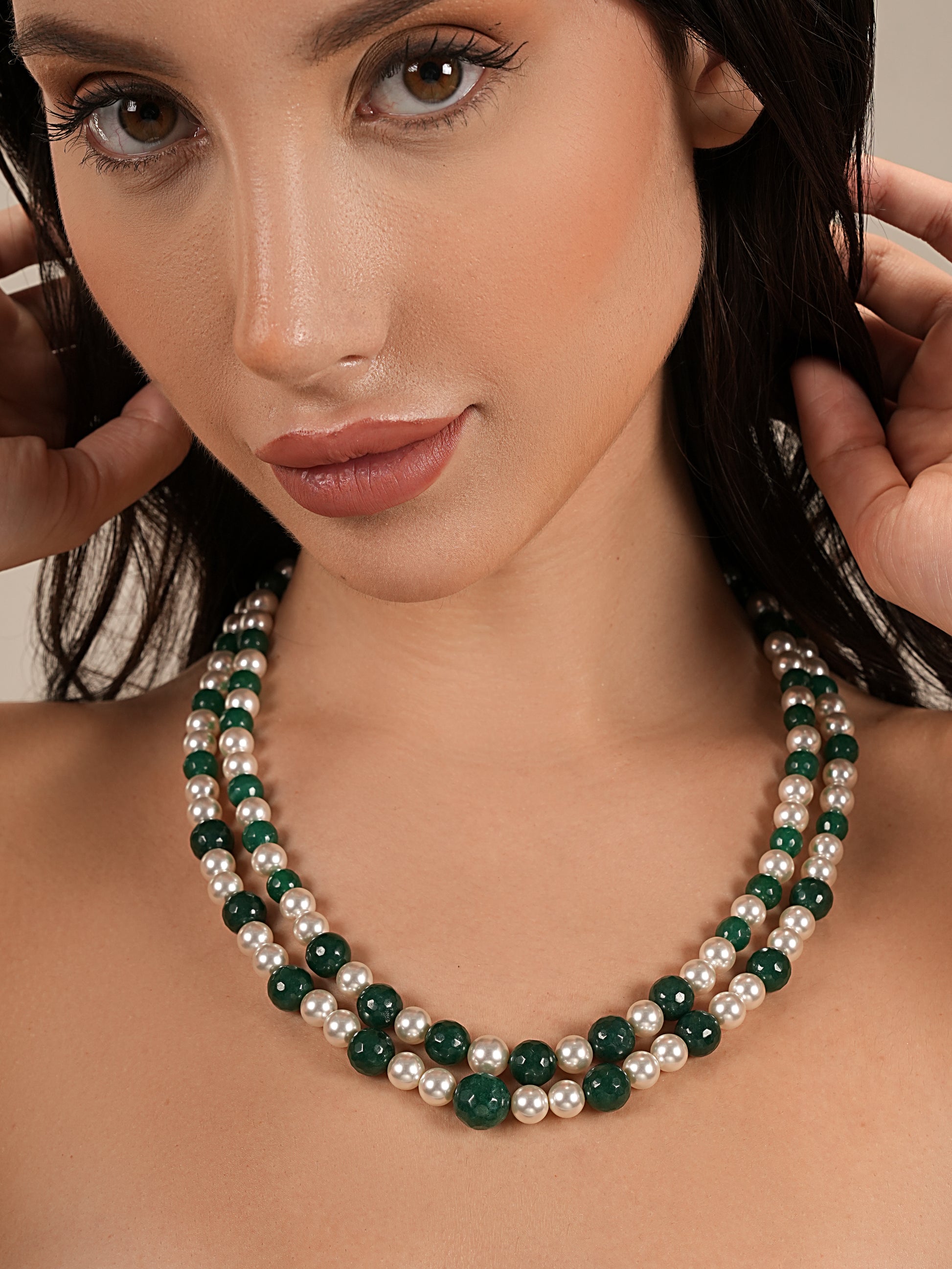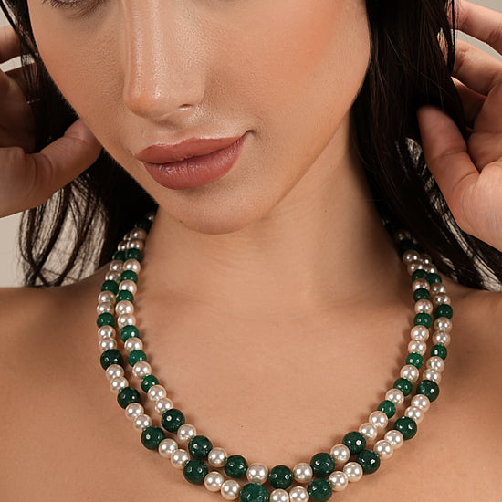 Unveil the luxury of tradition reimagined with the Basraa Emerald Green Radiance Dual-Layer Pearl Necklace.