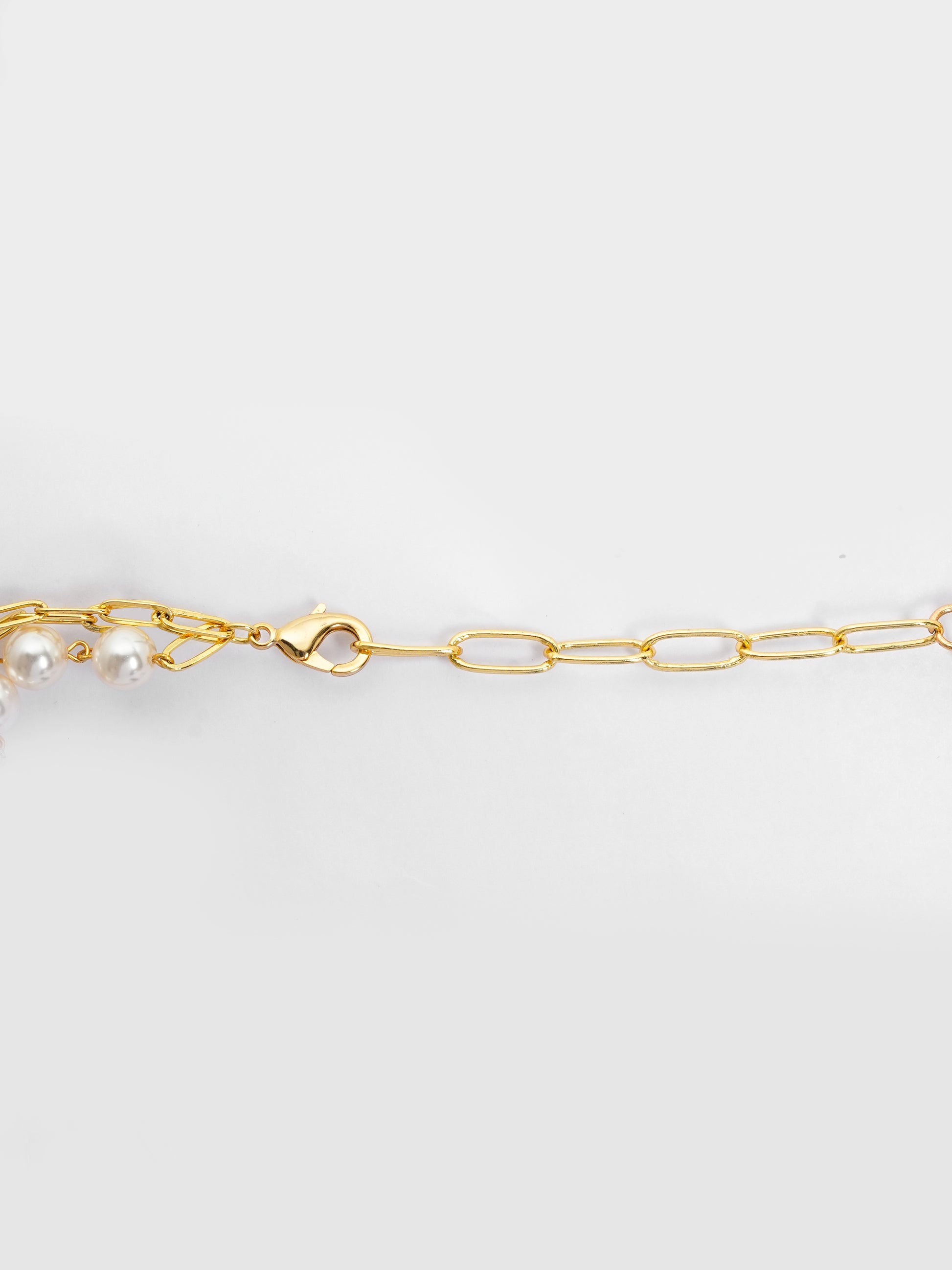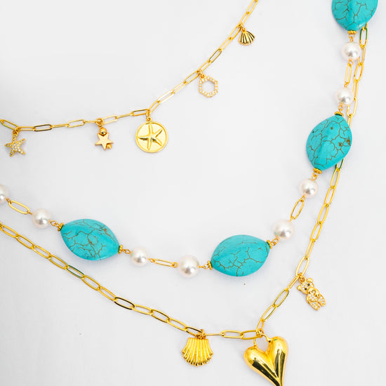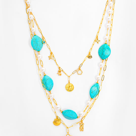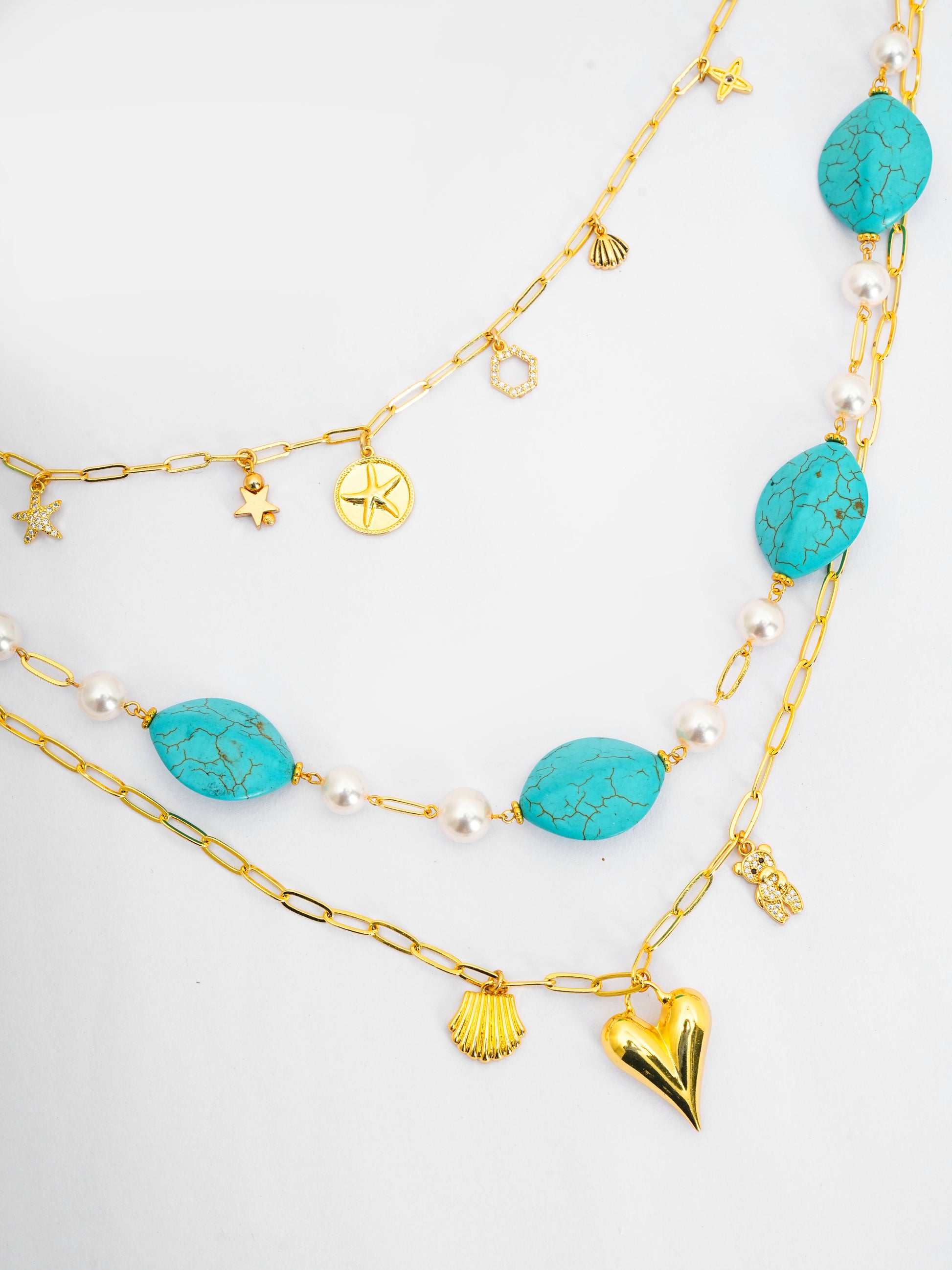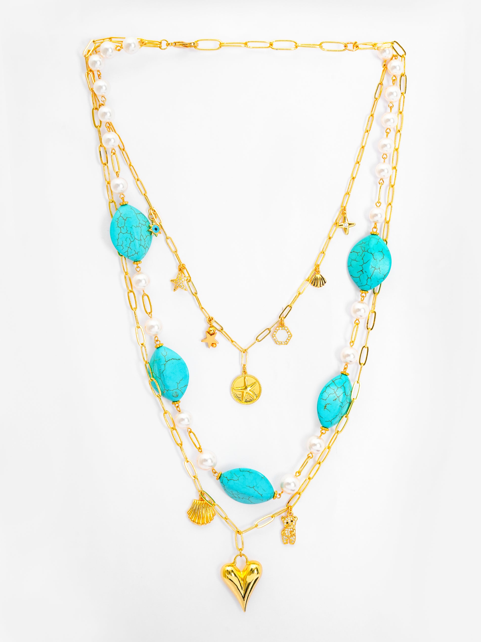 Basraa Turquoise & Pearl Layered Necklace with Golden Charms