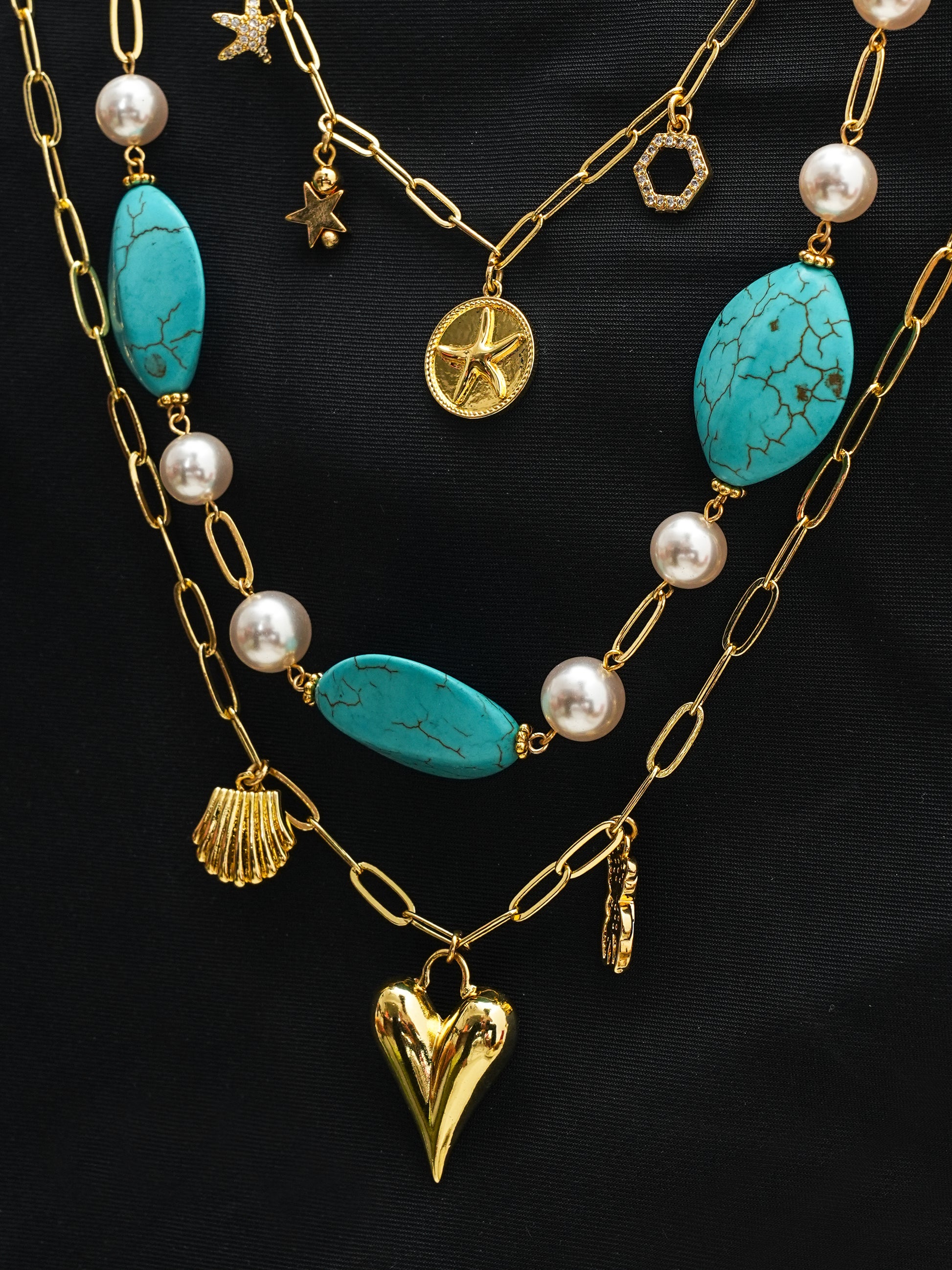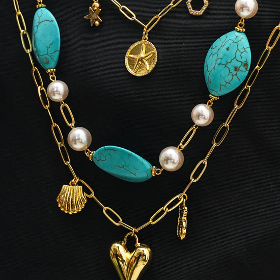 Bring oceanic elegance and boho luxury together with the Basraa Turquoise & Pearl Layered Necklace, a striking multi-layer creation that reflects the calm of the sea and the warmth of gold. Designed with vivid turquoise stones, lustrous Basraa-style pearls, and delicate gold-plated charms, this piece captures both charm and confidence in every layer.