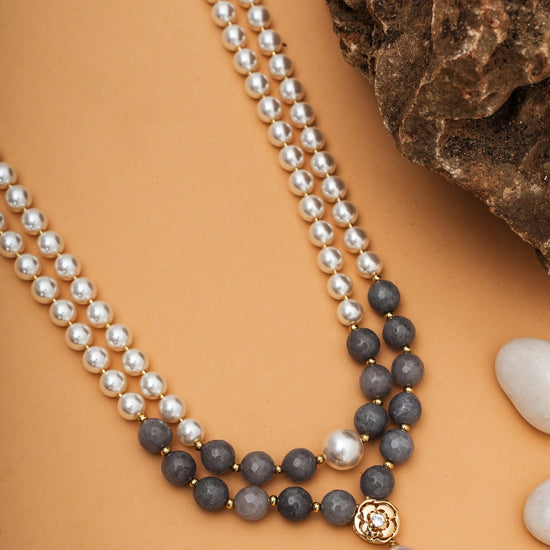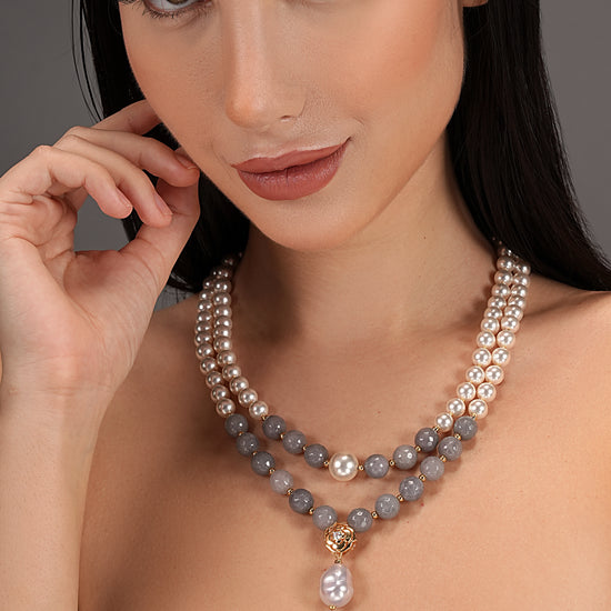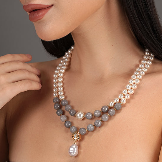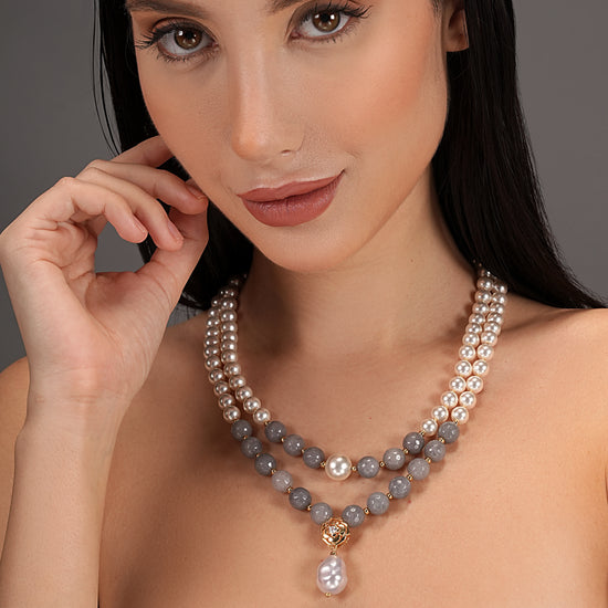 Grace, balance, and craftsmanship meet in this Basraa Pearl & Grey Agate Dual-Layer Necklace — a stunning blend of timeless pearls and modern gemstones.