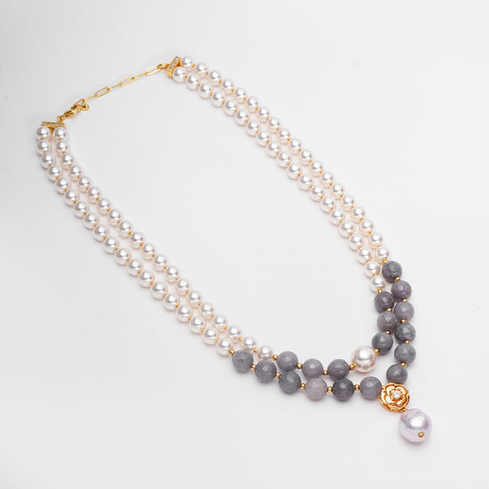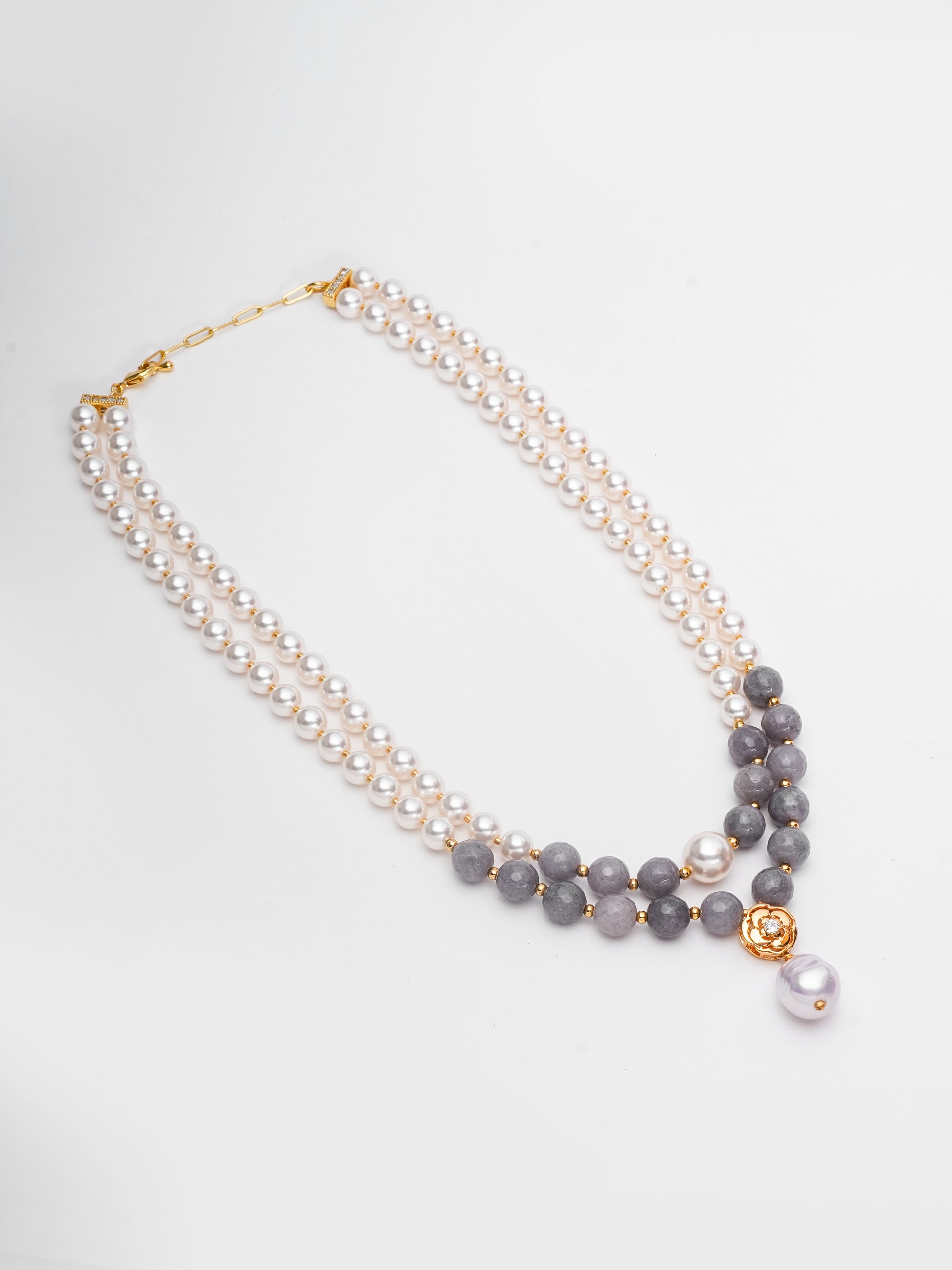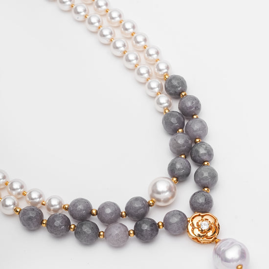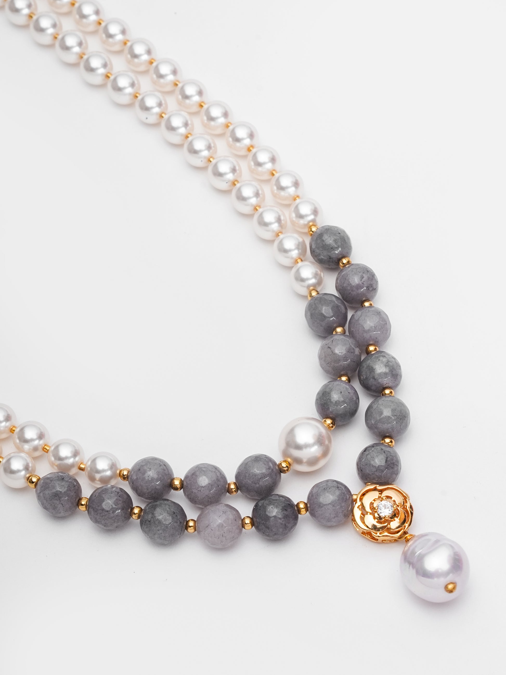 Basraa Pearl & Grey Agate Dual-Layer Necklace – Gold Floral Pendant Charm