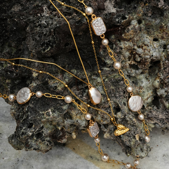 - Includes a sleek gold chain, textured heart charm, and irregular pearl drops