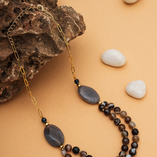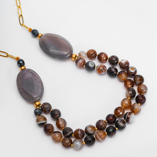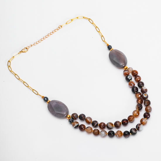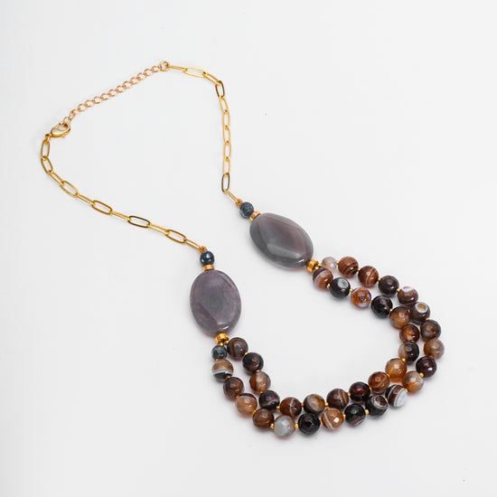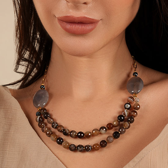 Dual-Layer Brown Agate Beaded Necklace with Smoky Quartz Accents – Basraa Natural Stone Collection