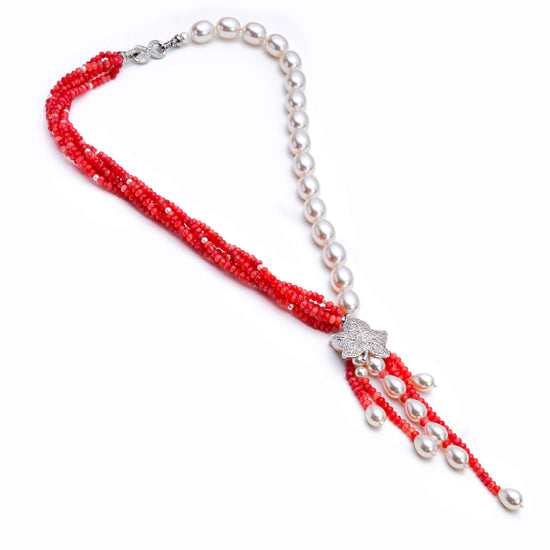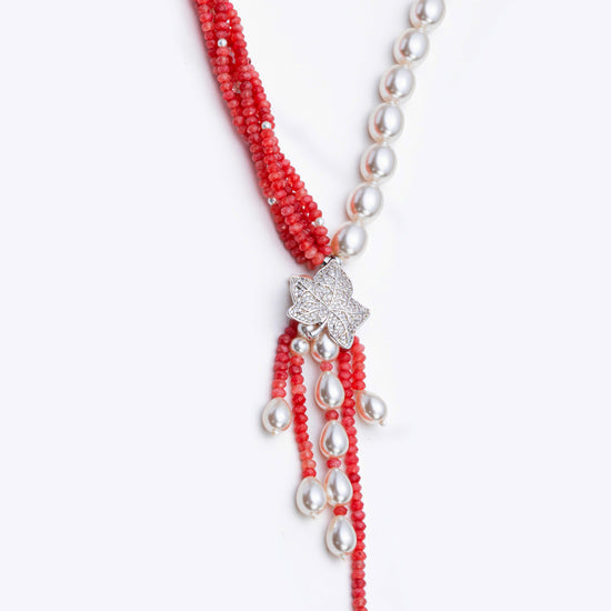 Design: Elegant mix of pearls, beads, and a dazzling floral pendant