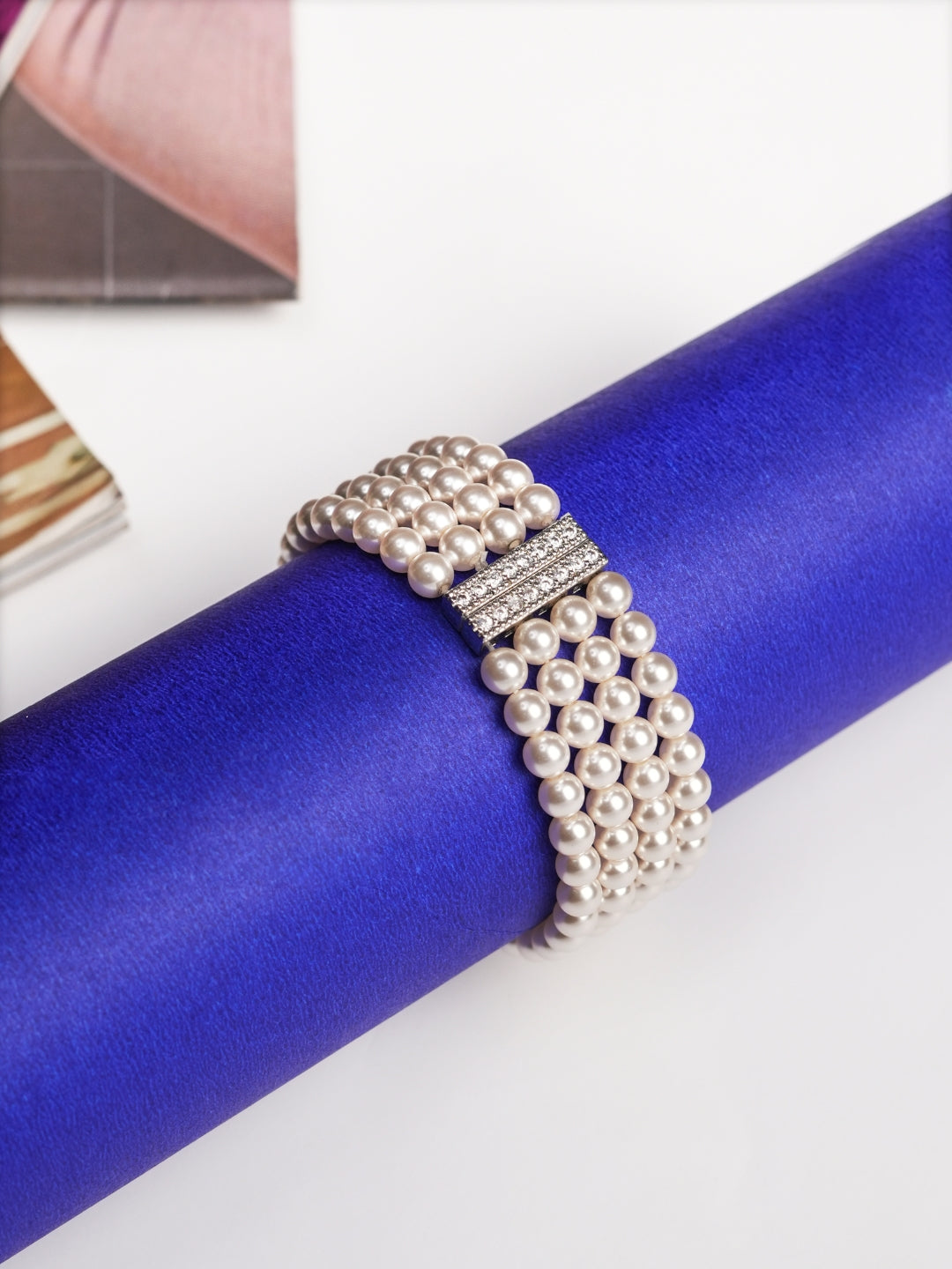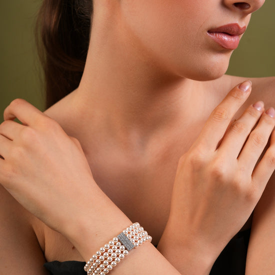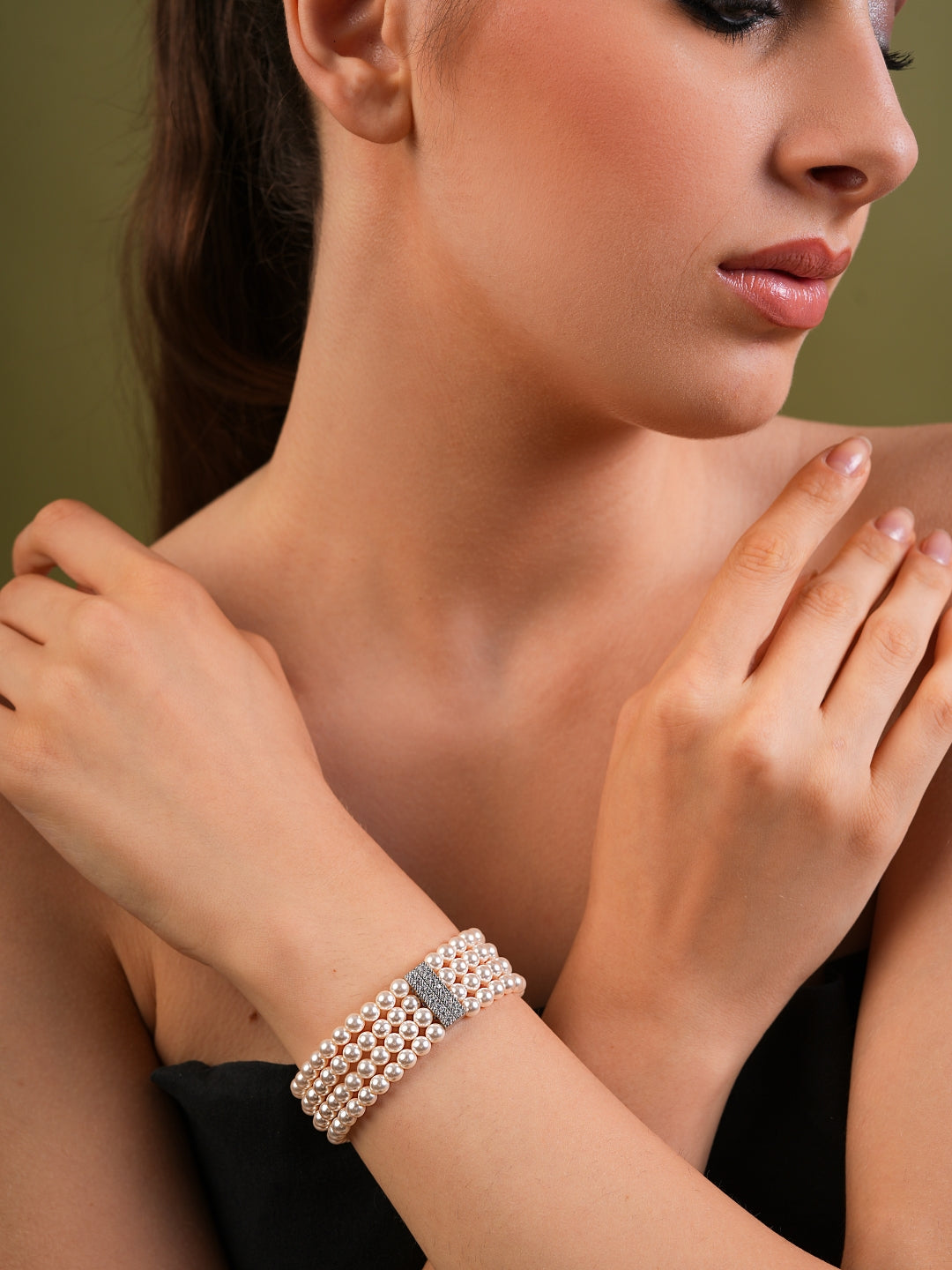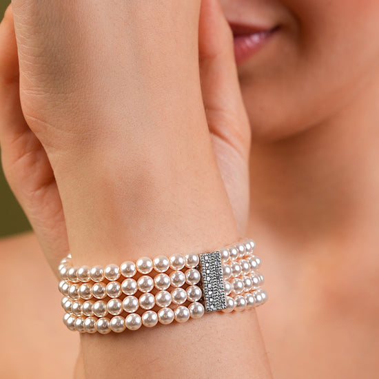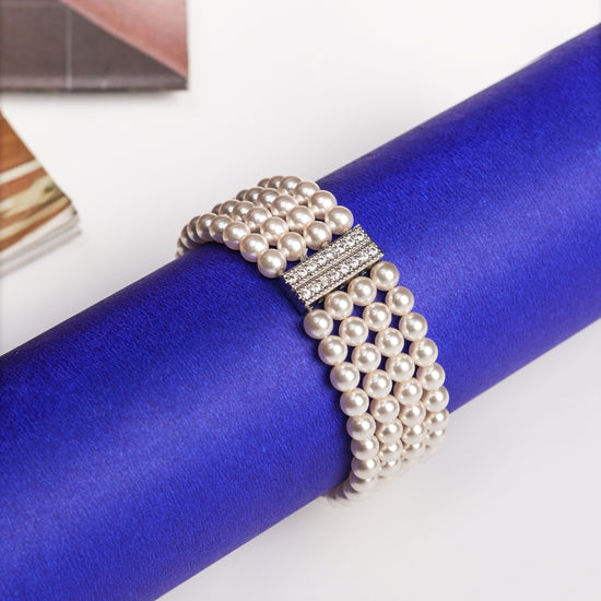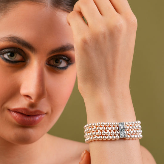 Elegant, timeless, and effortlessly regal — the Celeste Crown Pearl Bracelet is a four-strand stunner made with premium quality crystal pearls. Centered with a sparkling rhinestone clasp, this bracelet offers the perfect balance of classic charm and modern sophistication. Whether styled with festive attire or an evening gown, it adds a polished statement to any look.