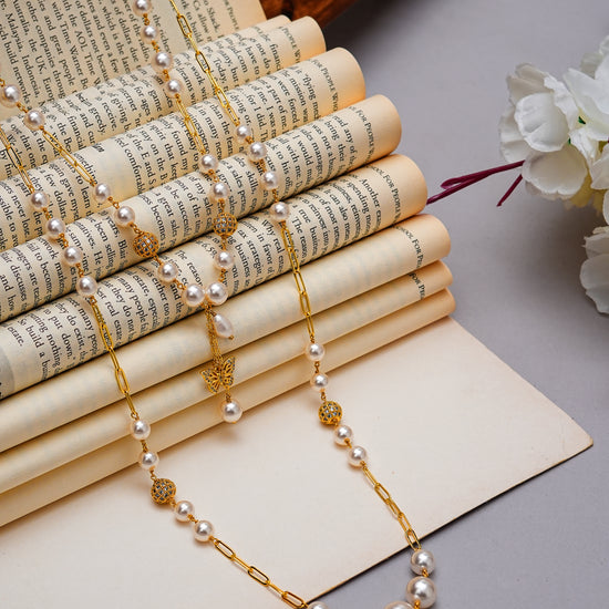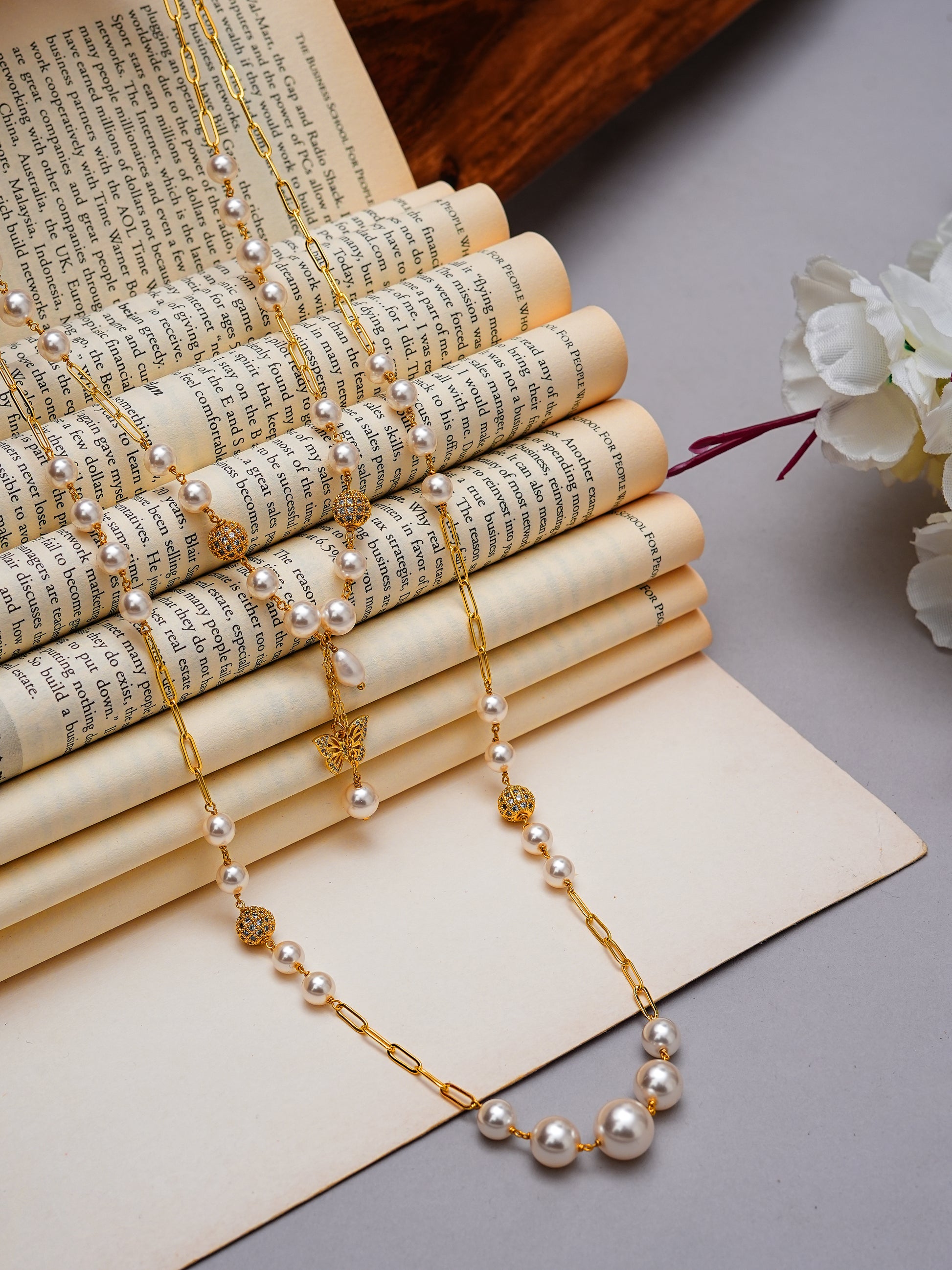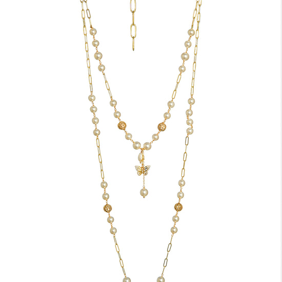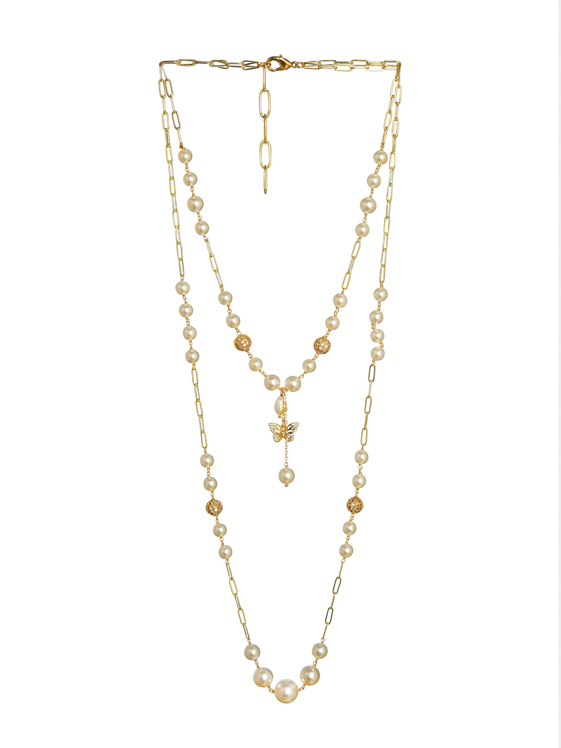 A two-tiered beauty blending classic pearls with gold-plated elegance, finished with pave beads and a butterfly charm for that extra sparkle.