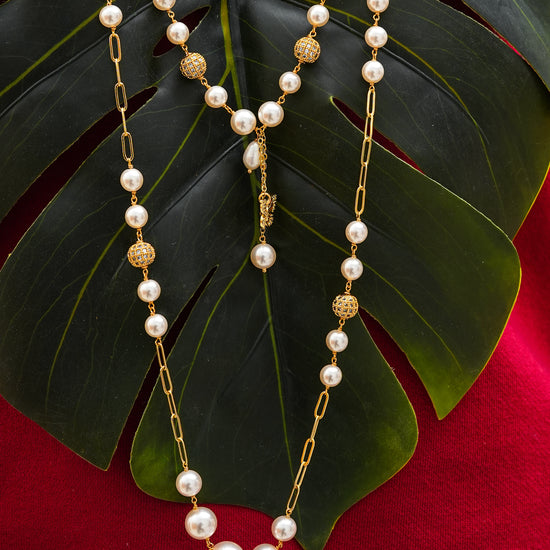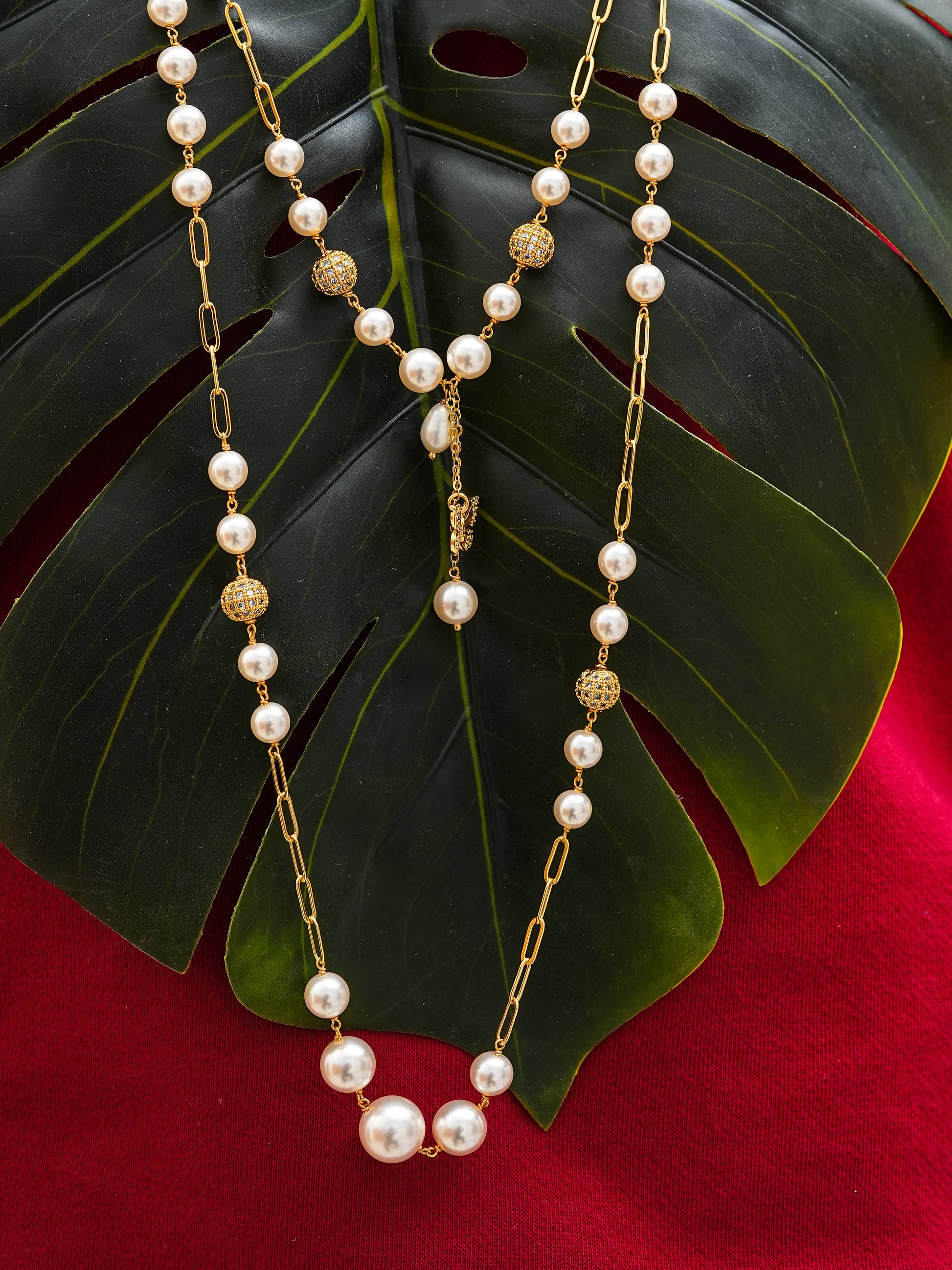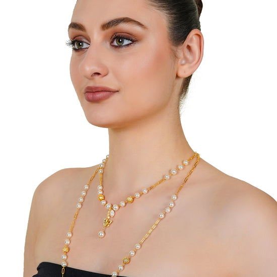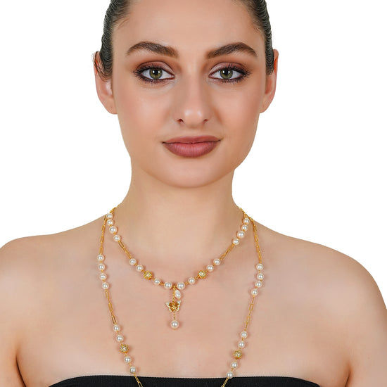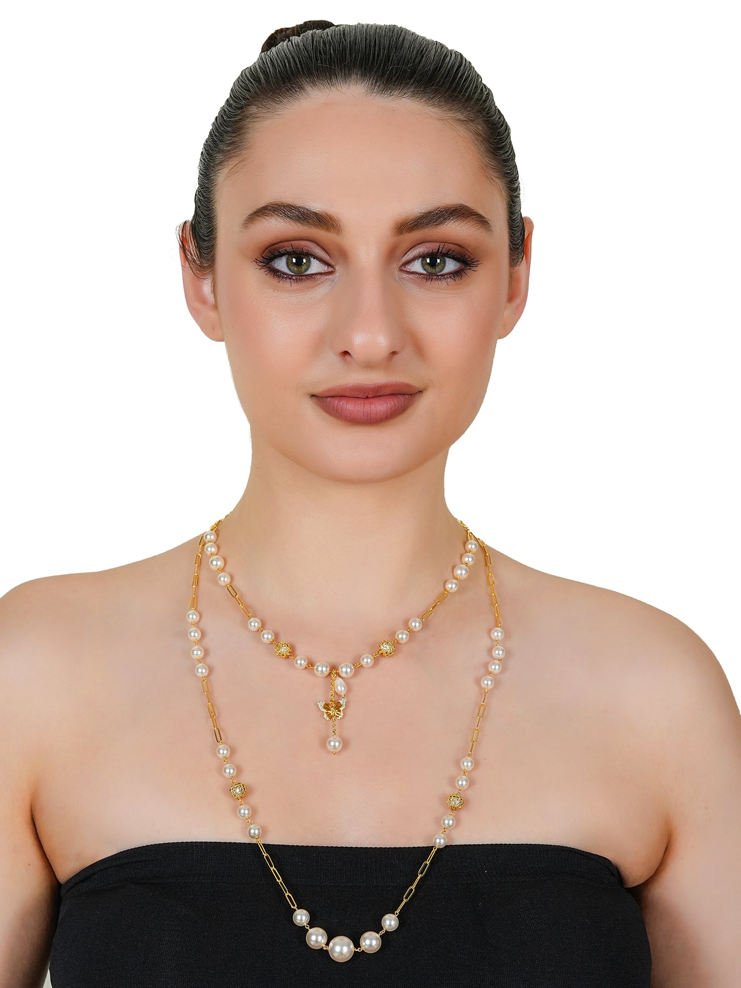 A two-tiered beauty blending classic pearls with gold-plated elegance, finished with pave beads and a butterfly charm for that extra sparkle.