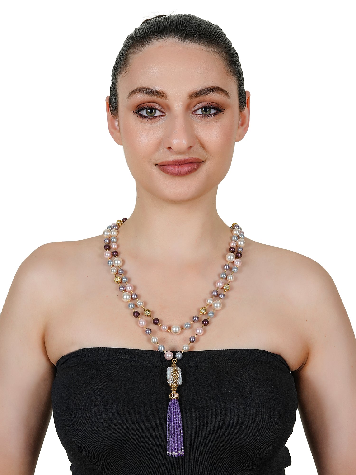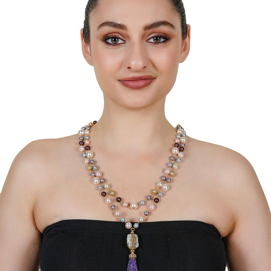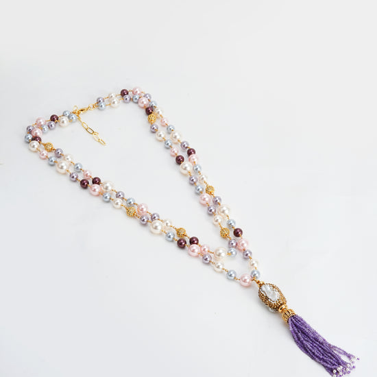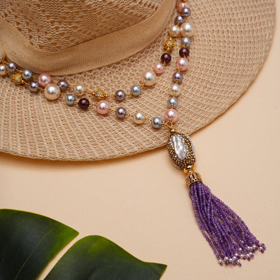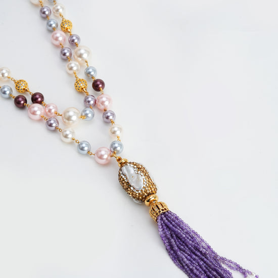 Design Highlight: Lavender beaded tassel with a detailed, ornate baroque pearl pendant