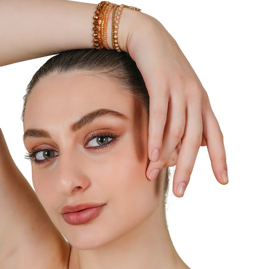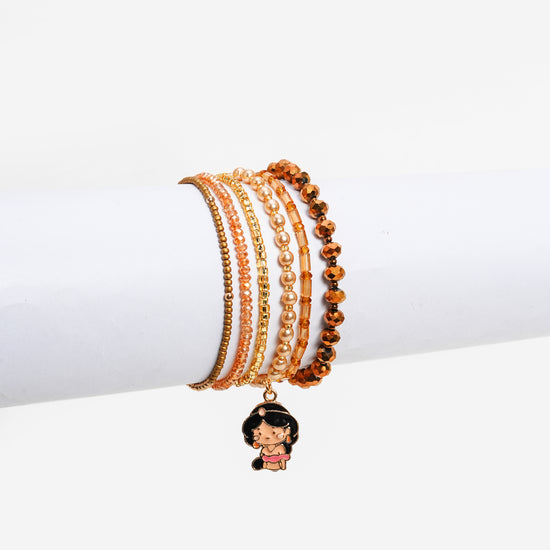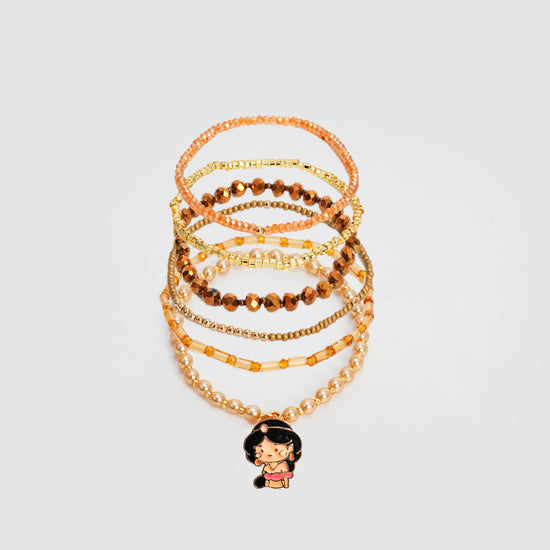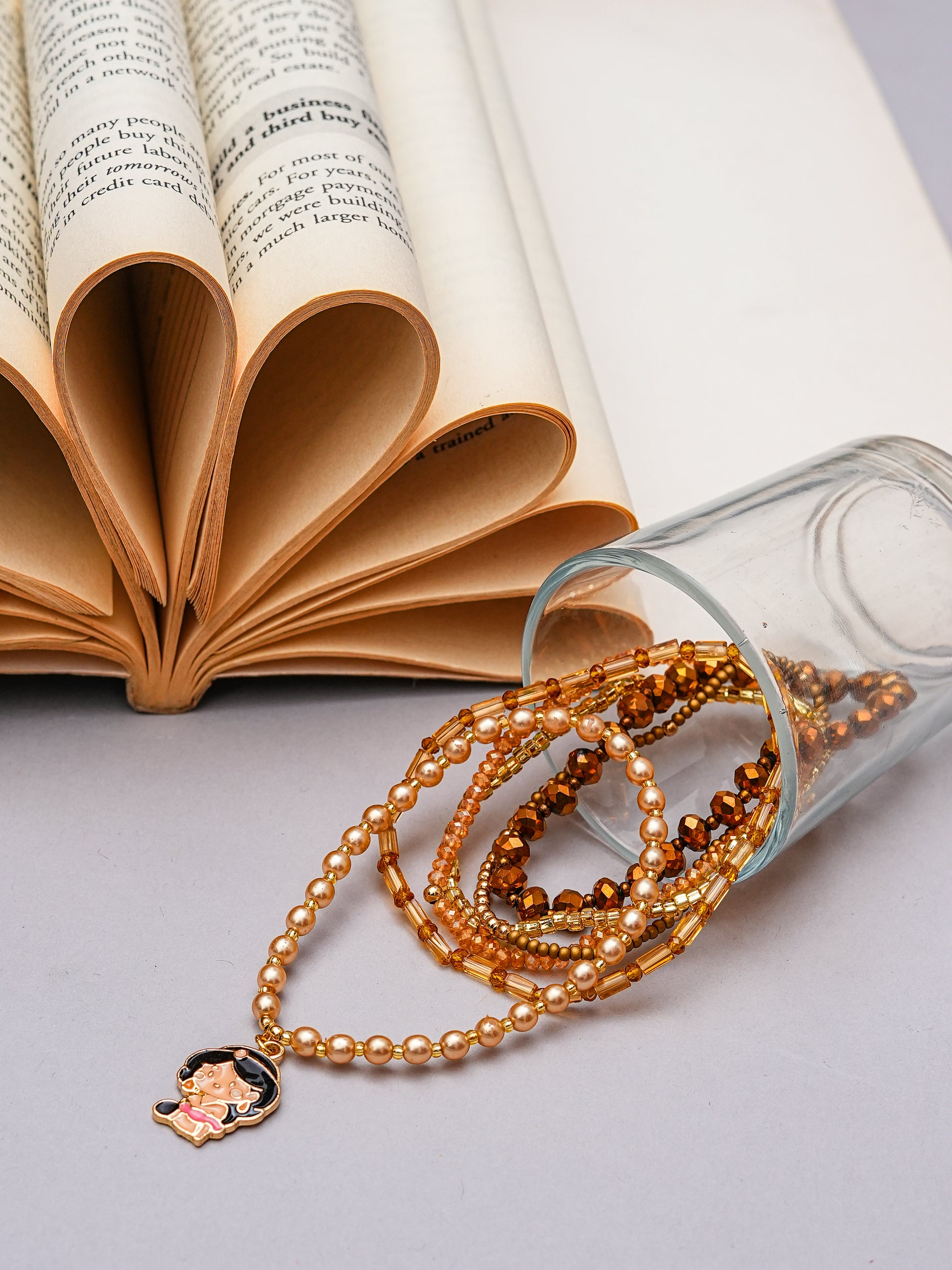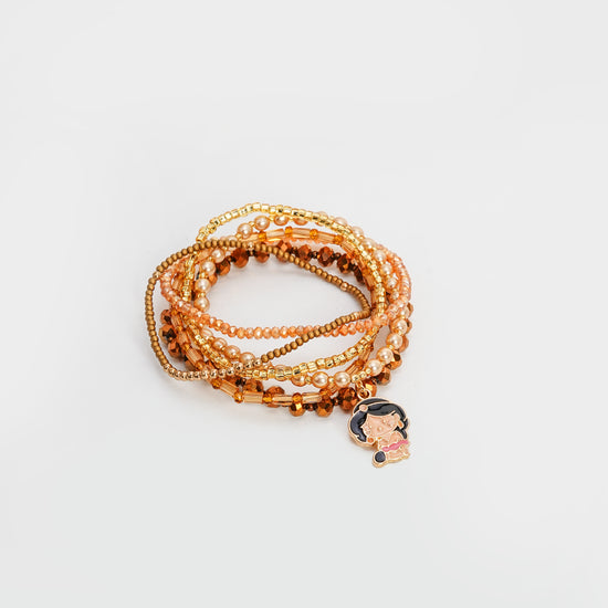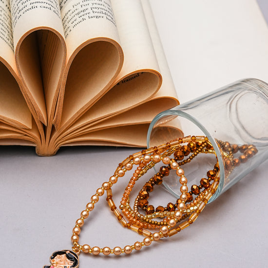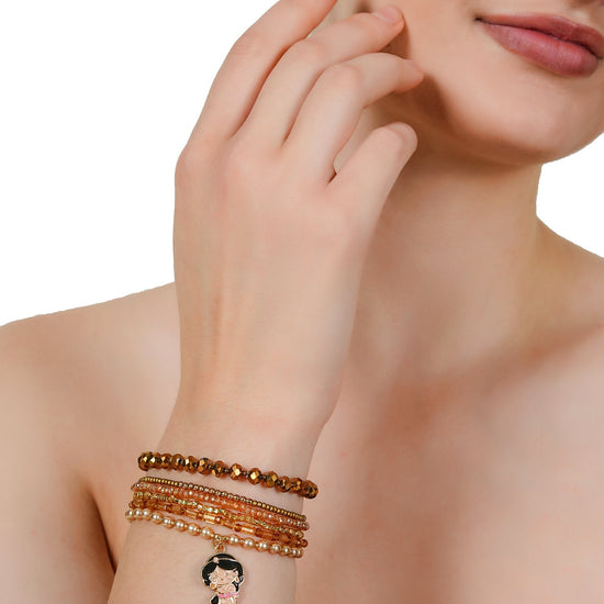 The Choco Charm Bracelet Set is a perfect blend of elegance and fun, designed for those who love to add a touch of sparkle and personality to their accessories. This 6-piece bracelet stack features a mix of glass beads, crystal pearls, and an enamel cartoon charm, creating a stylish and playful look. With warm tones of chocolate, gold, and caramel, this set is ideal for festive occasions or everyday chic styling.