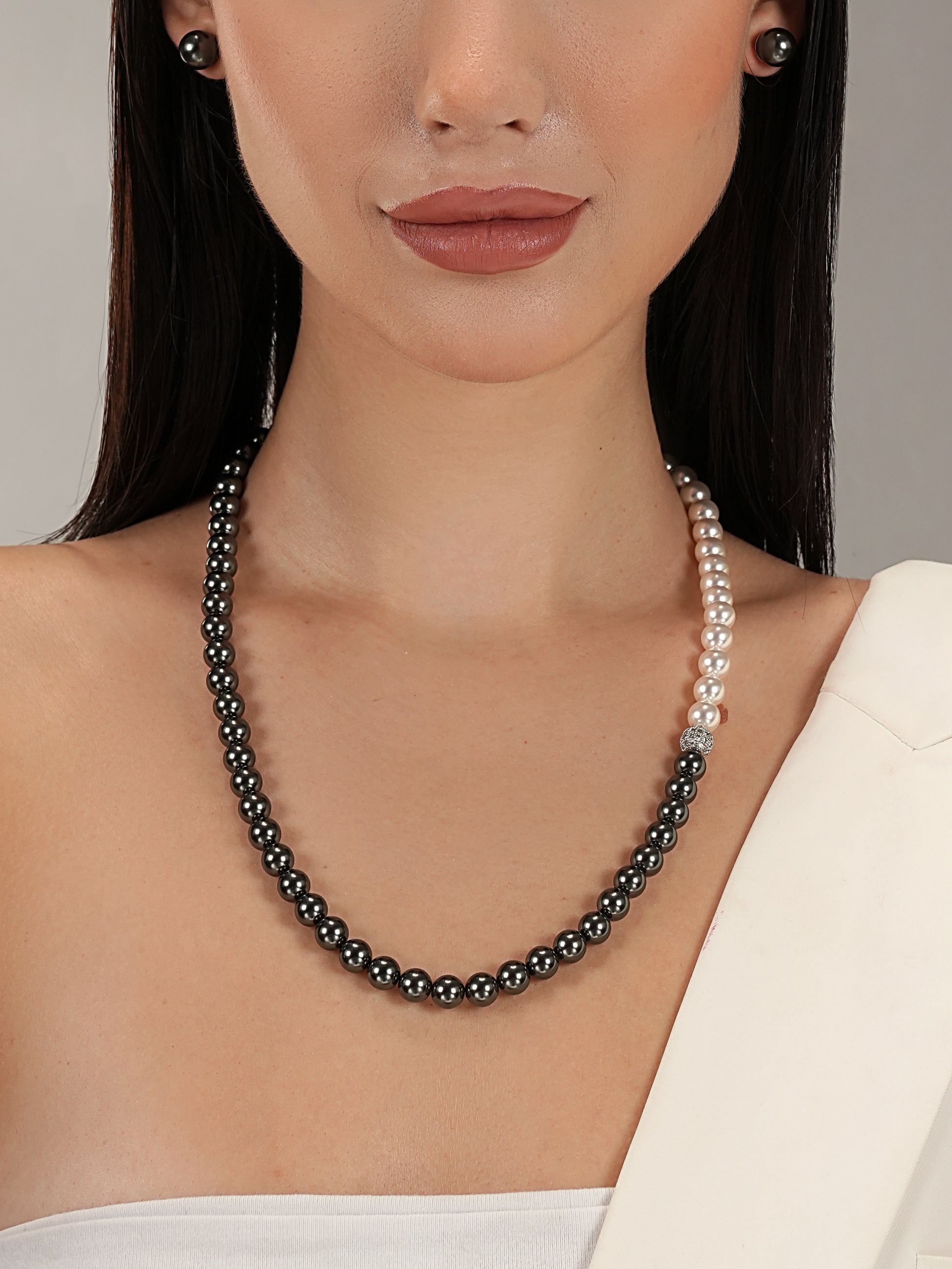 Experience timeless sophistication with this dual-tone pearl necklace that beautifully merges modern chic with classic grace. Featuring alternating rows of lustrous black and white simulated pearls, the design is elevated with a pave-set crystal bead centerpiece, adding a touch of glamour. Perfect for both day wear and evening soirées, this necklace complements Western formals and traditional Indian attire alike.