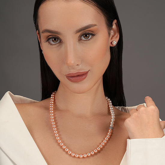 Immerse yourself in the art of luxury with the Basraa Peach Blush Dual-Tone Pearl Necklace, a radiant blend of soft peach and luminous ivory pearls handcrafted to perfection.