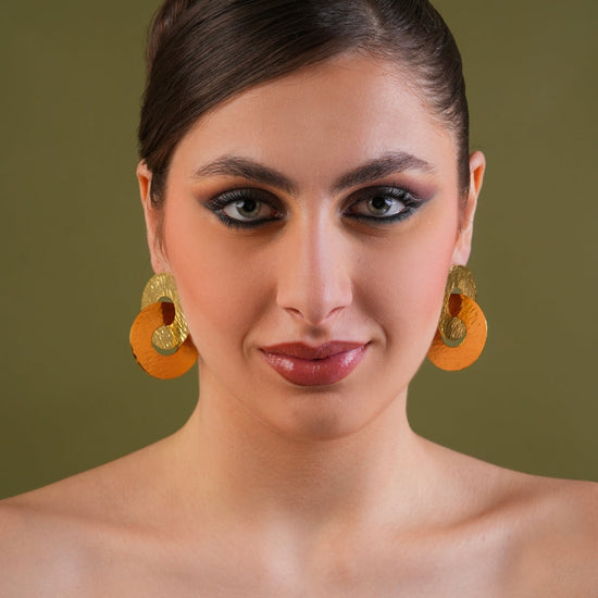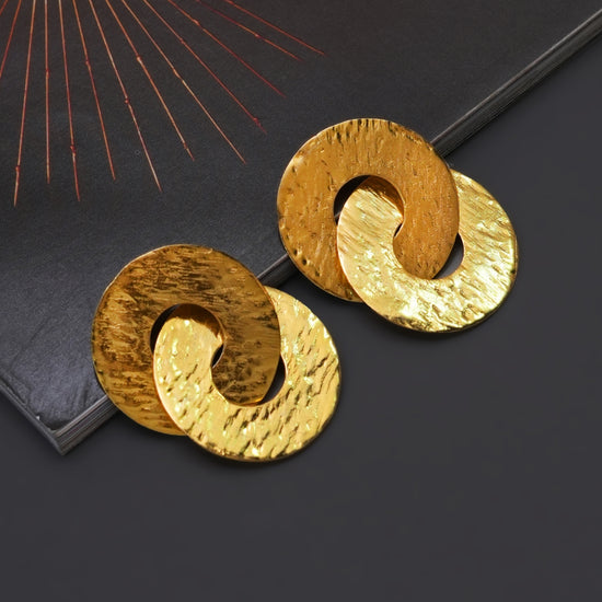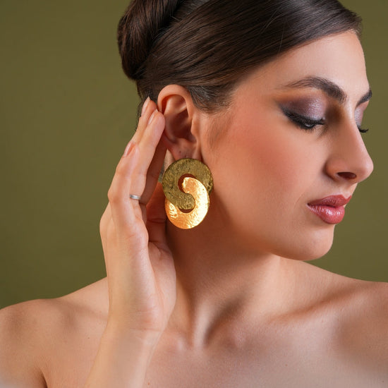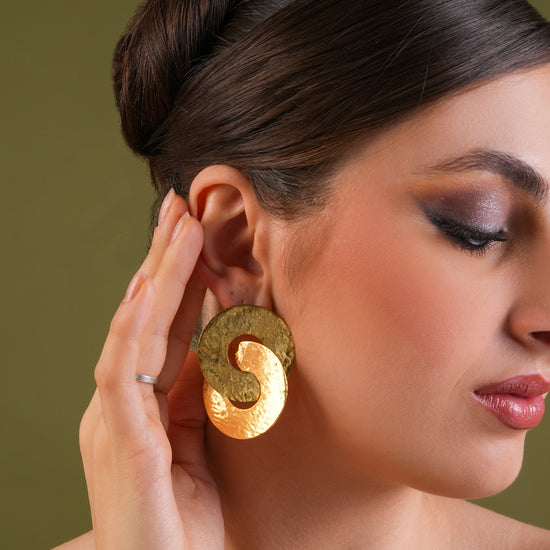 Where texture meets timeless design — the Eclipse Link Statement Earrings are an ode to bold simplicity. Crafted from premium brass alloy, these earrings feature two interlocked, hammered gold discs that reflect light with a rich, molten glow. Their fluid circular form symbolizes strength, connection, and effortless elegance. Ideal for pairing with power suits, silk sarees, or cocktail ensembles, these are pieces that speak volumes without saying a word.