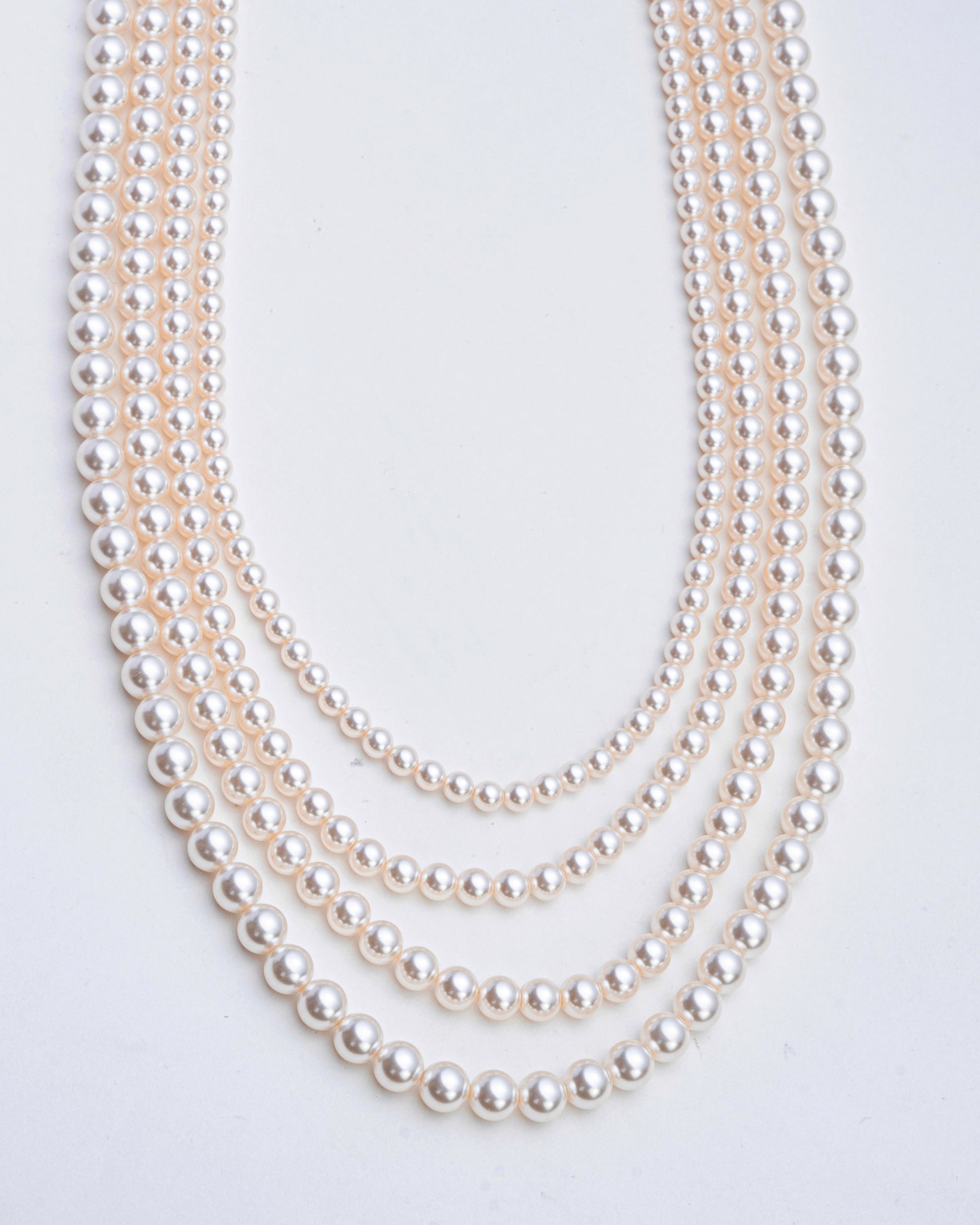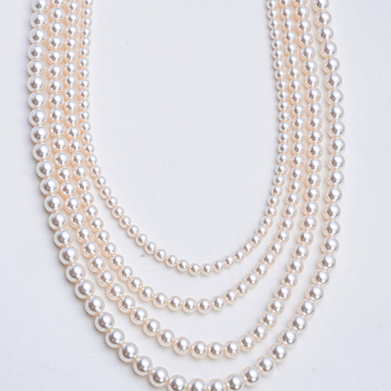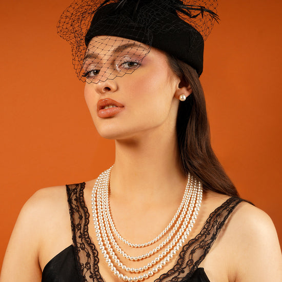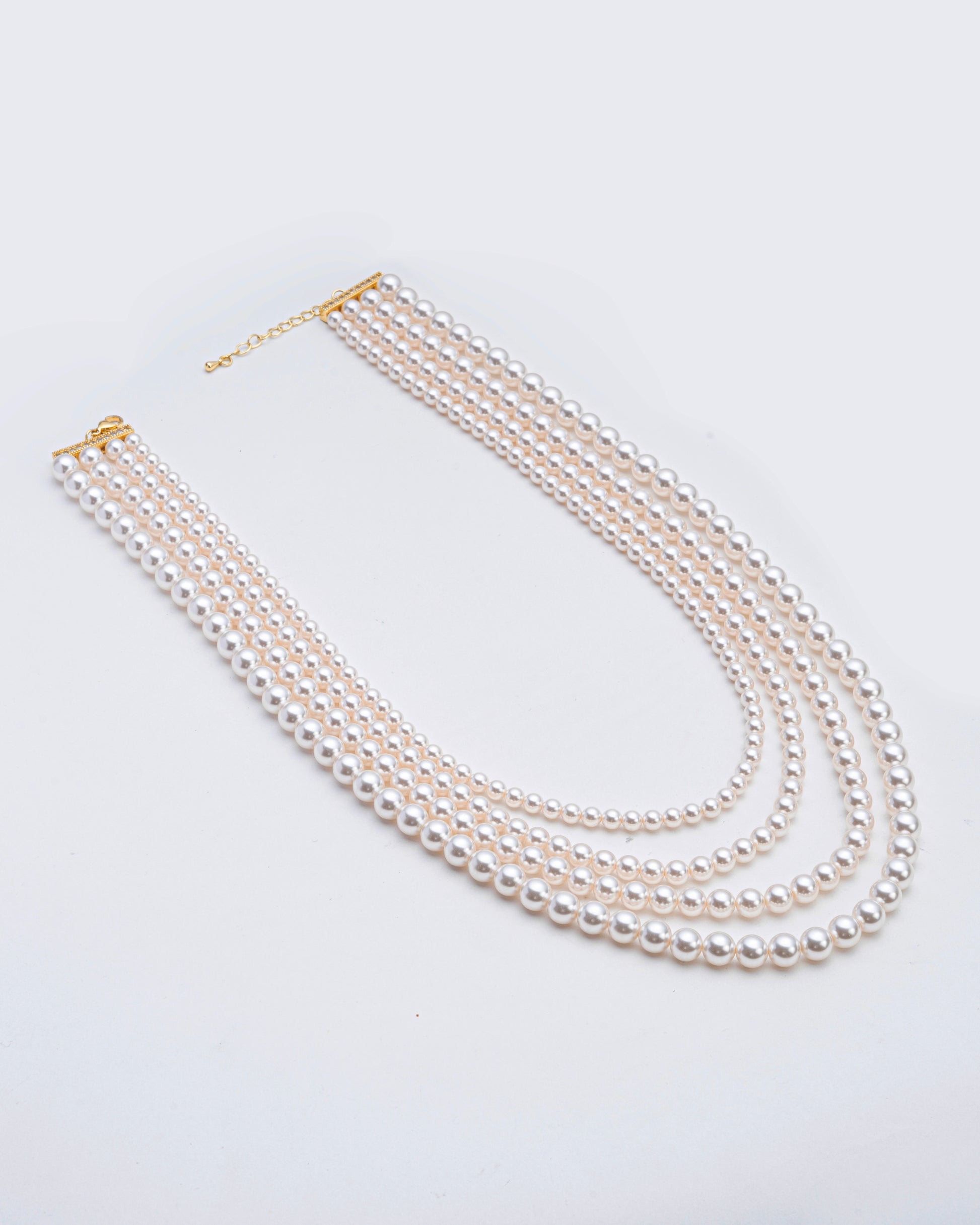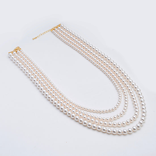 Embrace the timeless allure of pearls with the Elysian Grace Layered Necklace, a stunning accessory that redefines sophistication. This meticulously designed piece features five cascading layers of radiant white crystal pearls, each strand elegantly proportioned to create a beautiful draped effect. Enhanced with gold-toned accents and an adjustable clasp, this necklace combines classic charm with modern versatility.