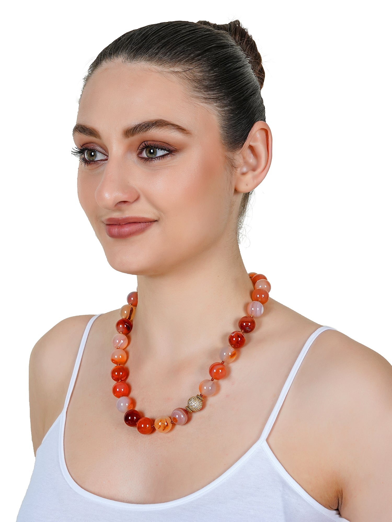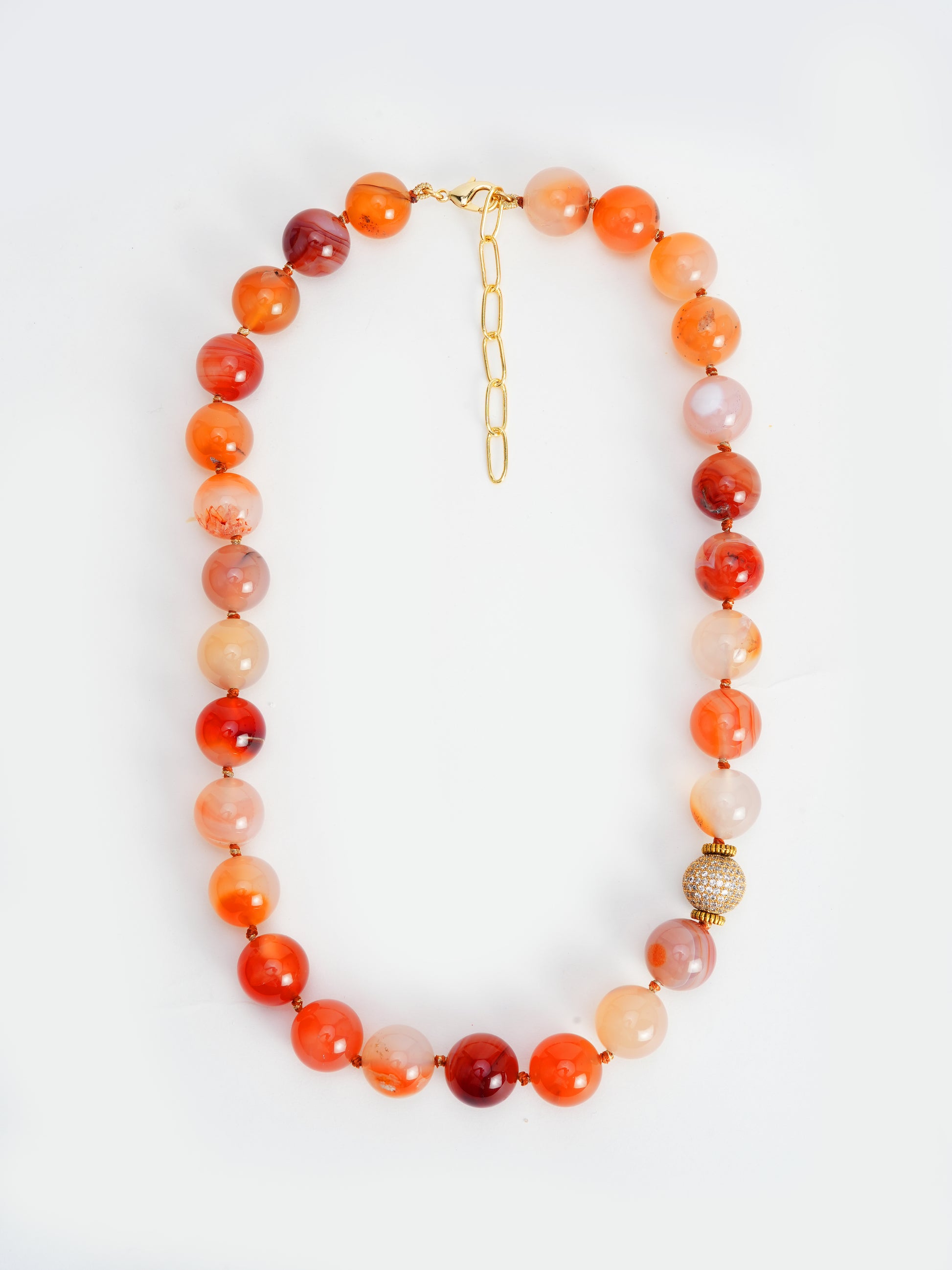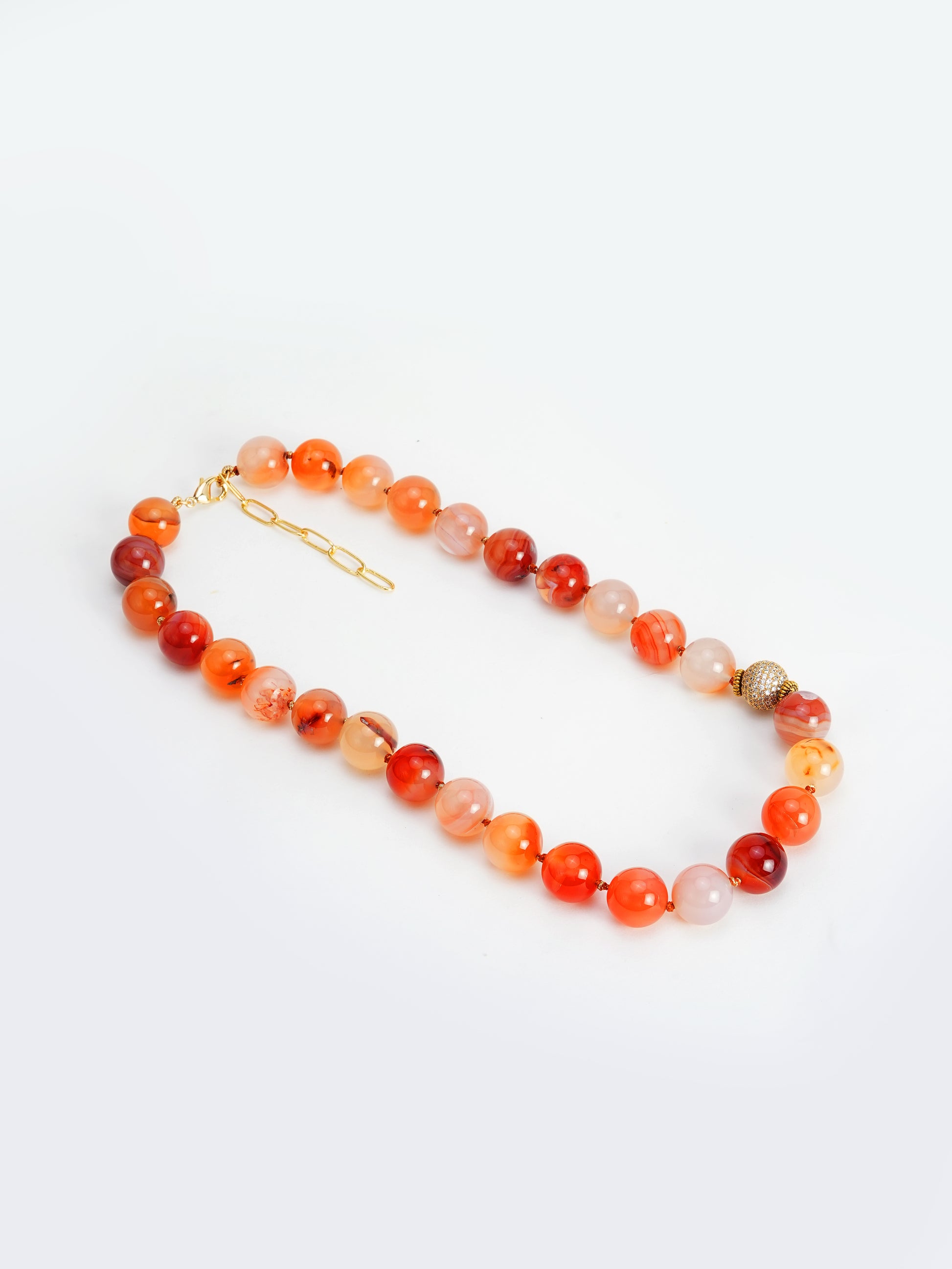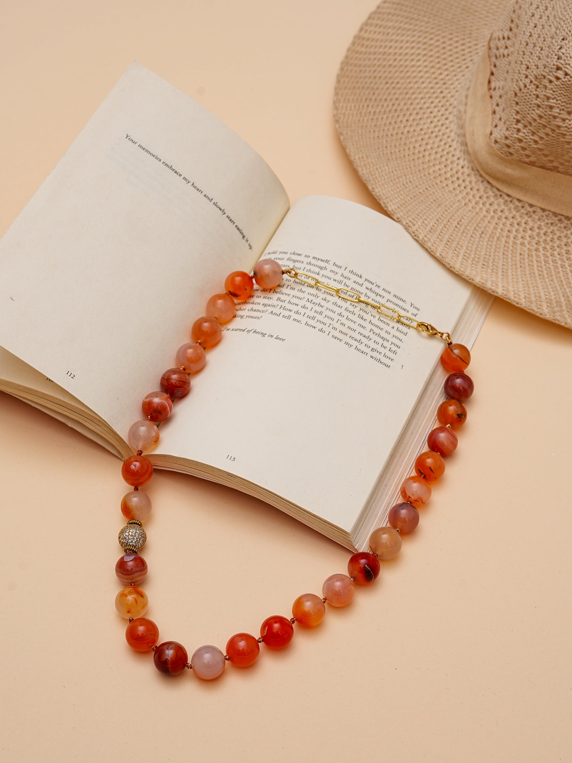 Ignite your style with the Ember Agate Necklace, a mesmerizing blend of warmth, passion, and timeless elegance. Featuring 14mm hand-selected semi-precious agate beads, this statement piece showcases a rich palette of burnt orange, deep red, and golden hues, reminiscent of glowing embers. The gold-plated adjustable chain ensures a customized fit, while a pavé-encrusted accent bead adds a touch of refined sparkle.