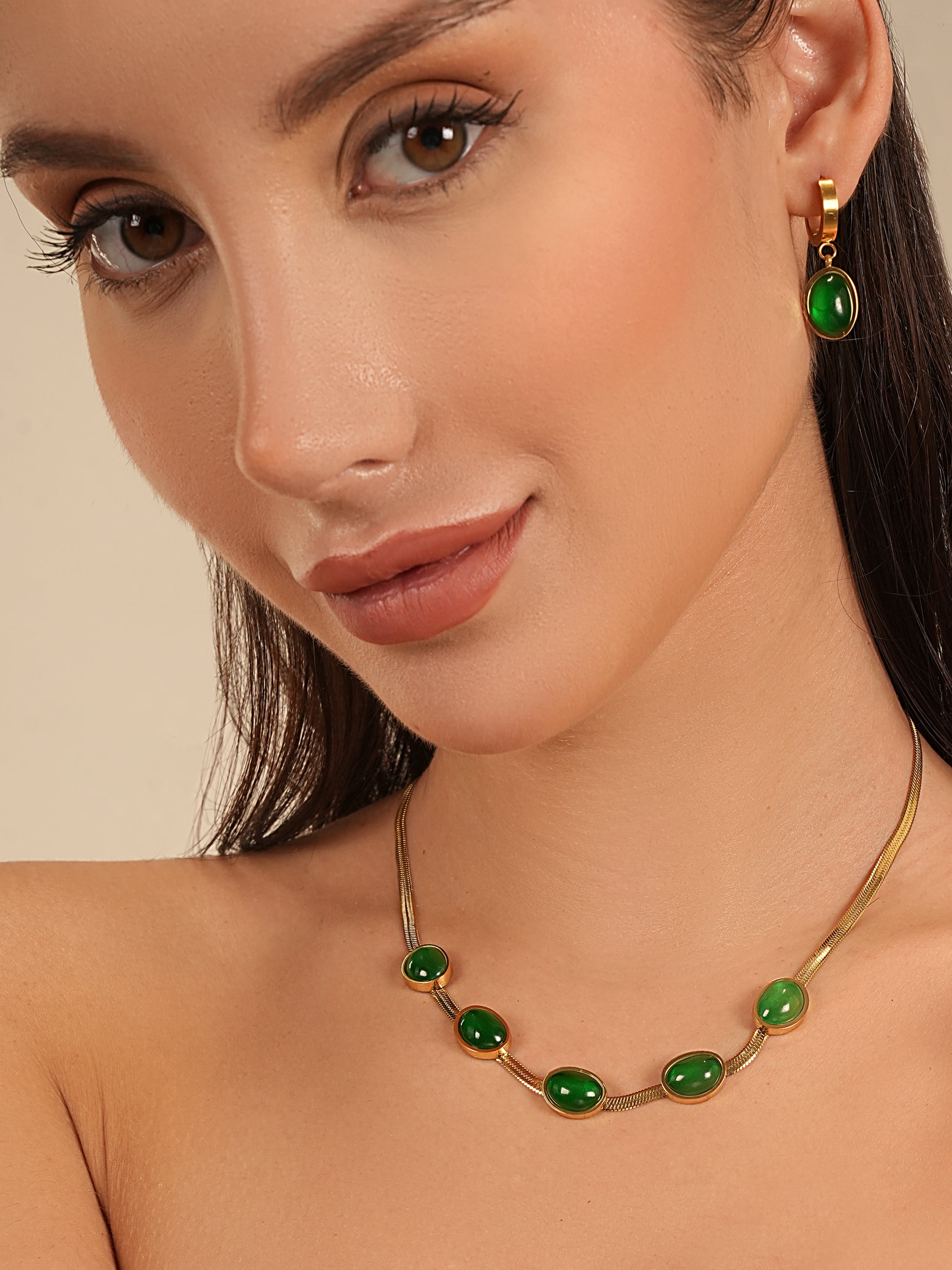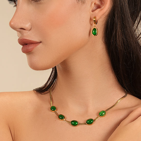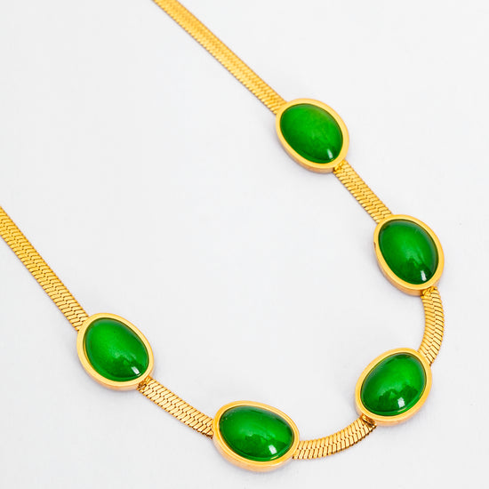 A sleek gold-tone necklace set with vivid emerald-green stones.