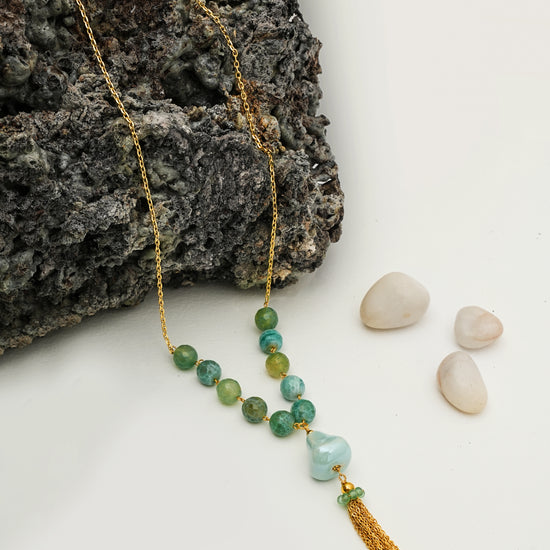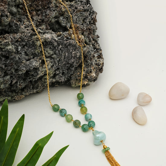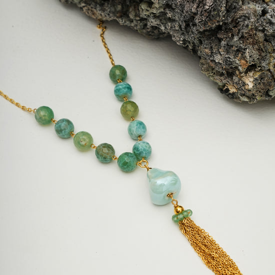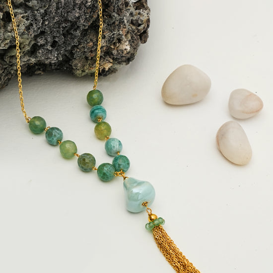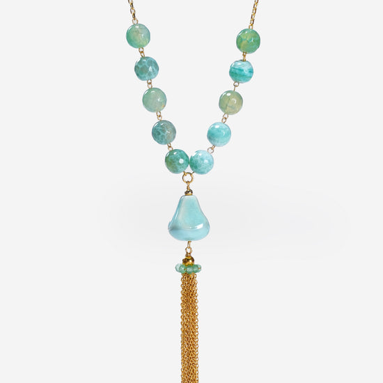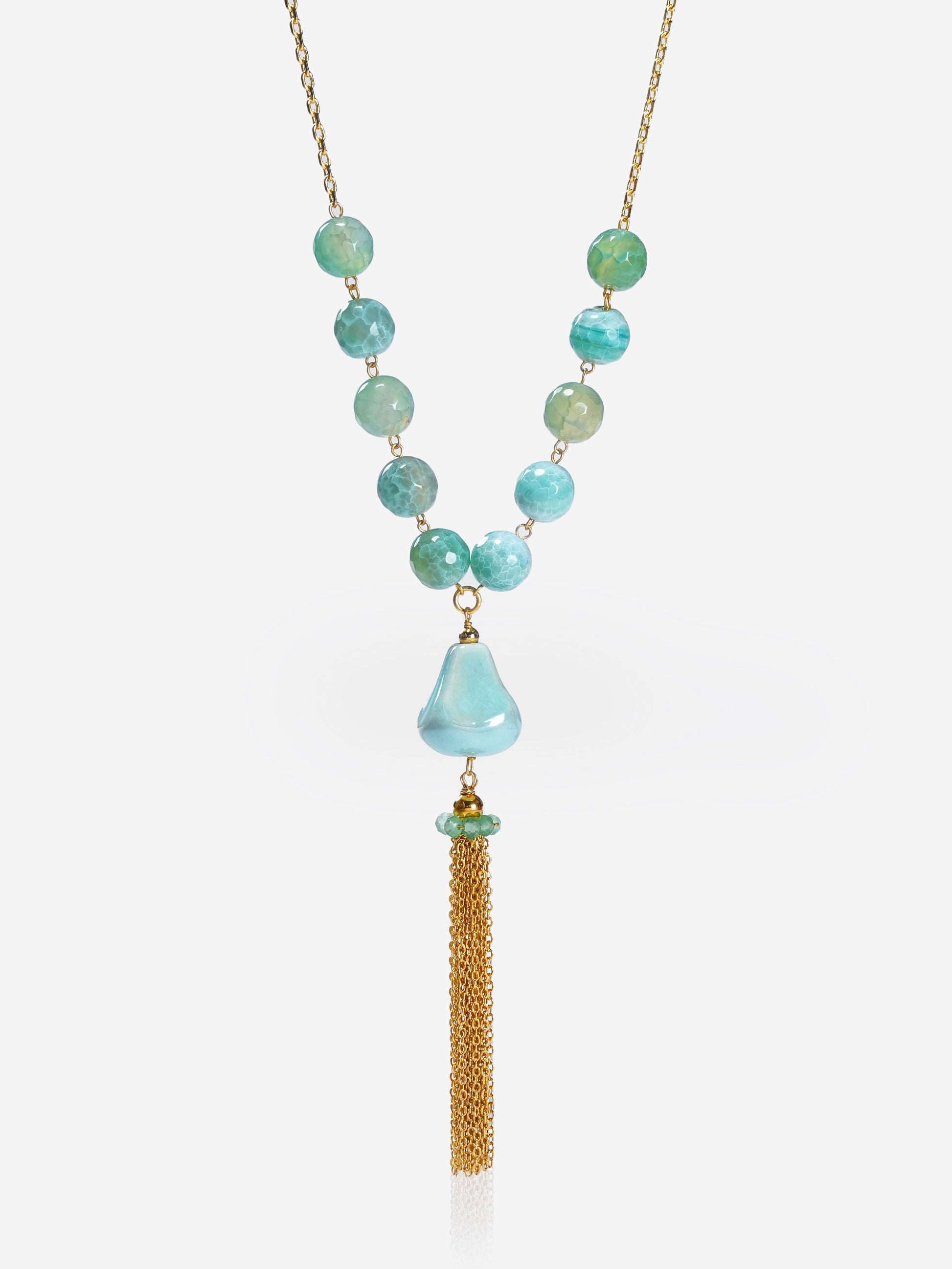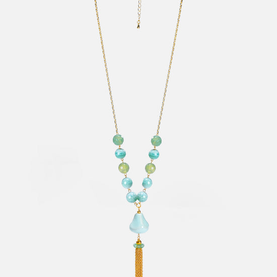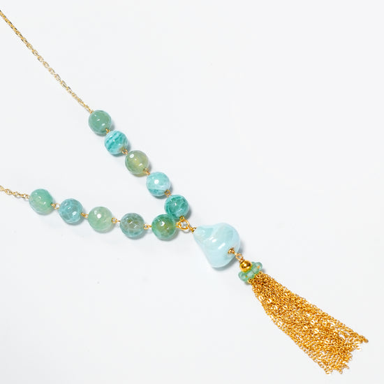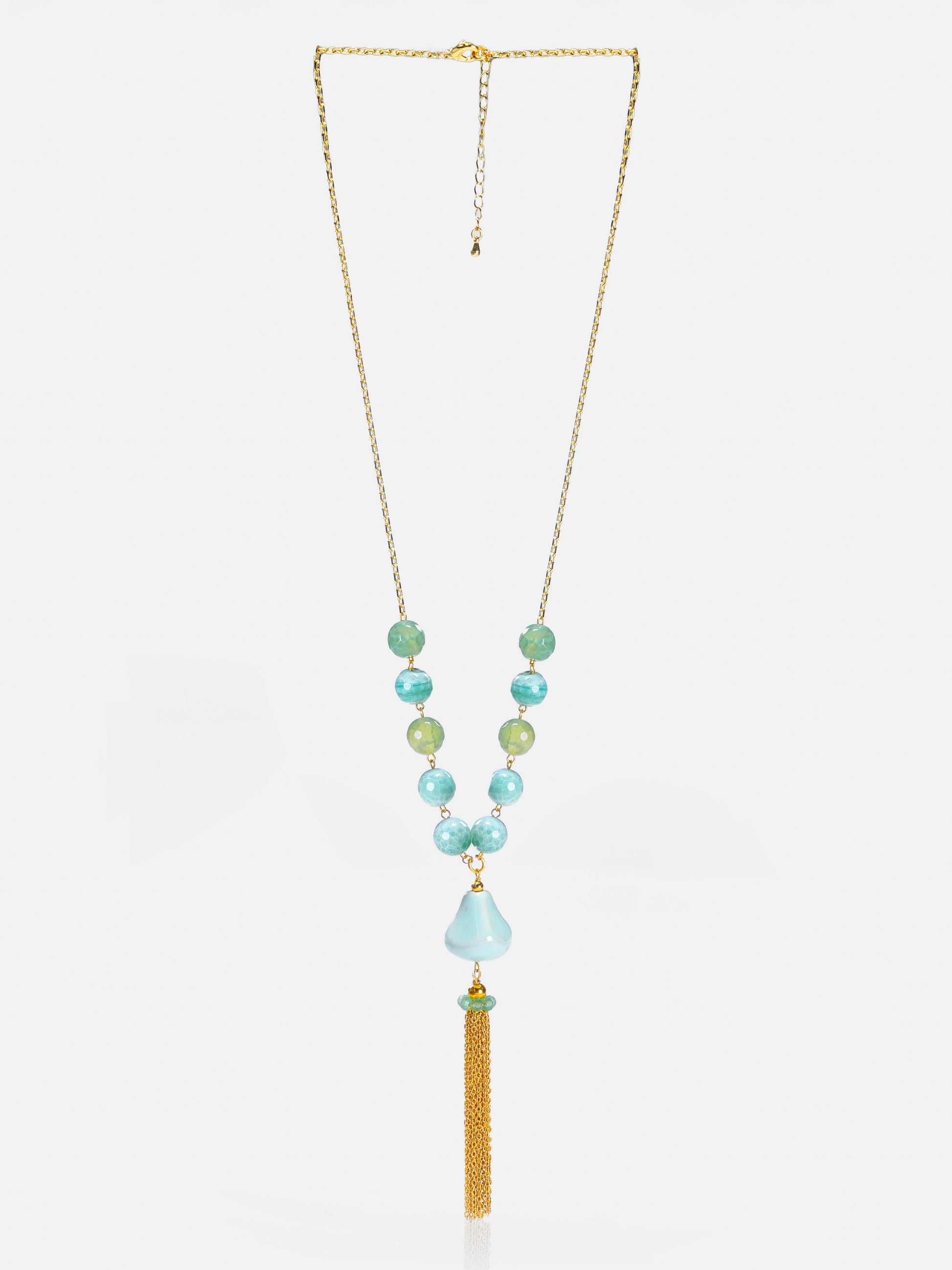 Aqua Green Agate Tassel Necklace – Gold-Plated Chain Statement Jewelry by Basraa