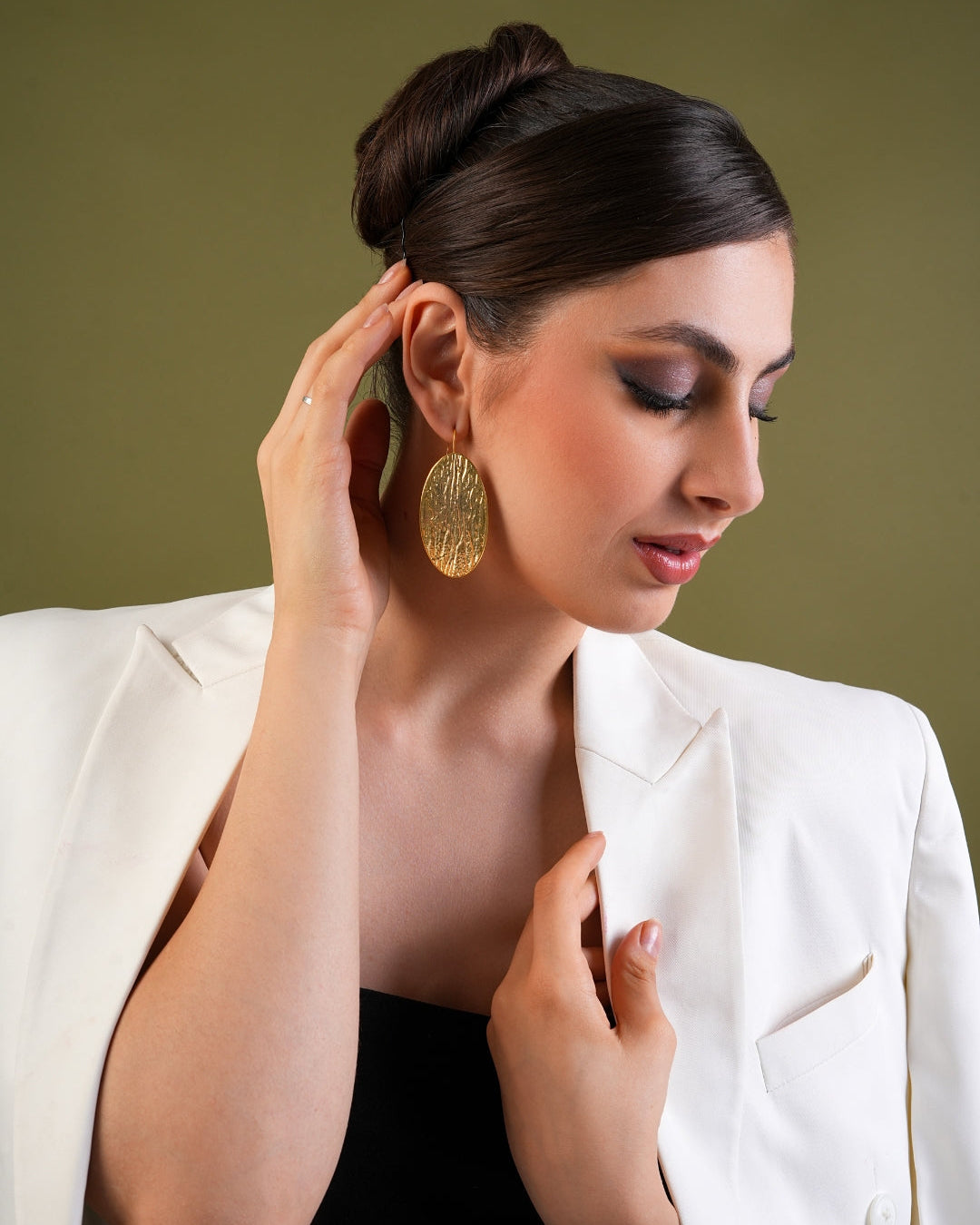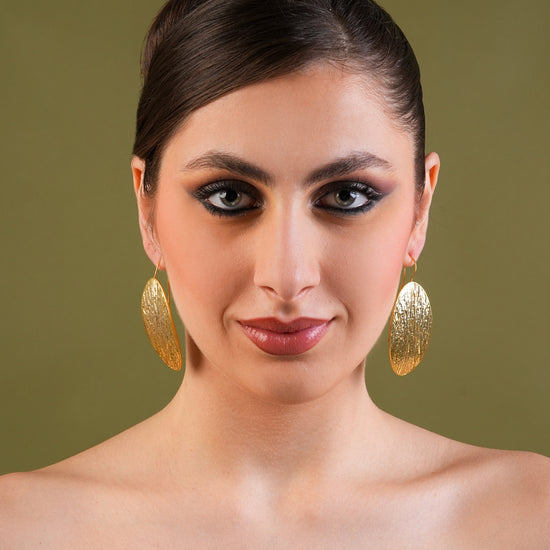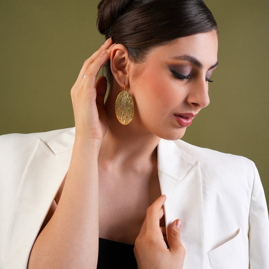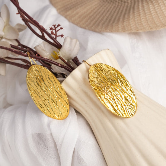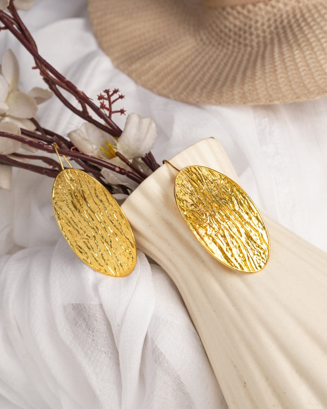 Inspired by textures found in nature, the Golden Bark Oval Earrings feature an elongated oval silhouette with intricate, bark-like detailing. Handcrafted from premium brass alloy and polished in a radiant gold finish, these earrings blend earthy character with modern sophistication. Their minimal shape paired with organic texture makes them perfect for both daytime elegance and evening drama.