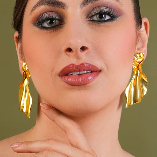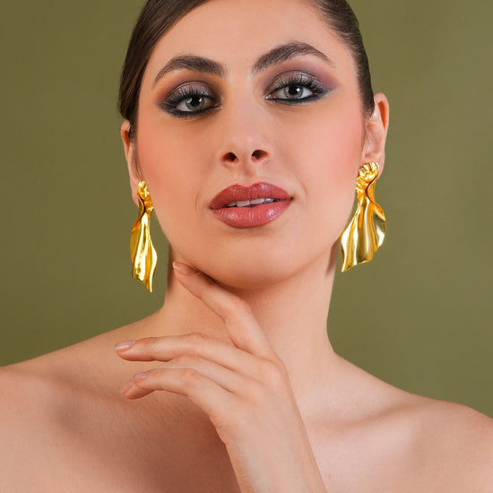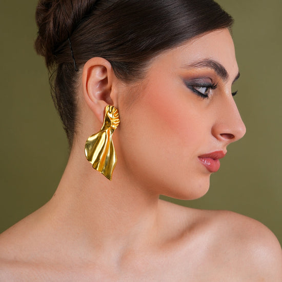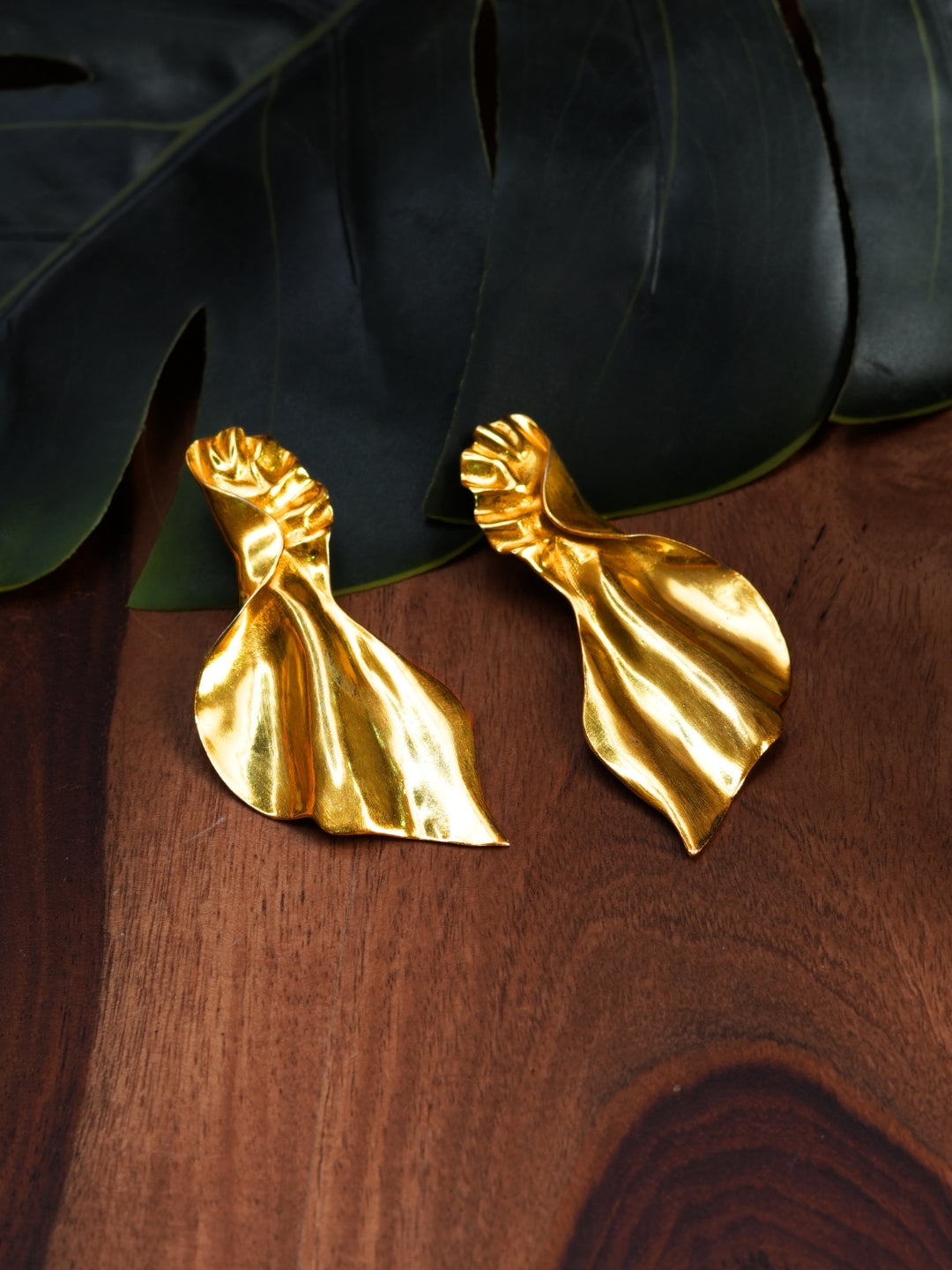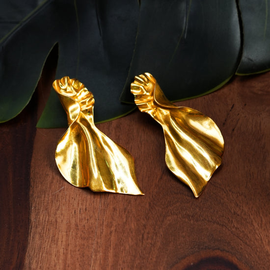 Dramatic and fluid, the Golden Drape Sculptural Earrings are a celebration of movement frozen in time. Inspired by flowing fabric and organic forms, these earrings are crafted from premium brass alloy and finished in a luminous gold sheen. The pleated top flows seamlessly into a broad wave-like form, creating a graceful yet powerful silhouette. Ideal for statement-making occasions where elegance meets edge.