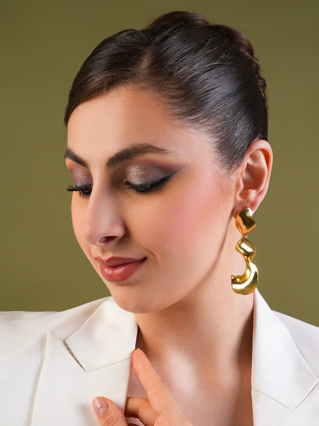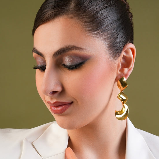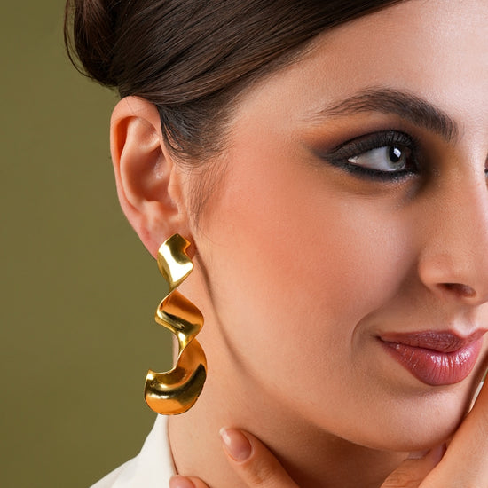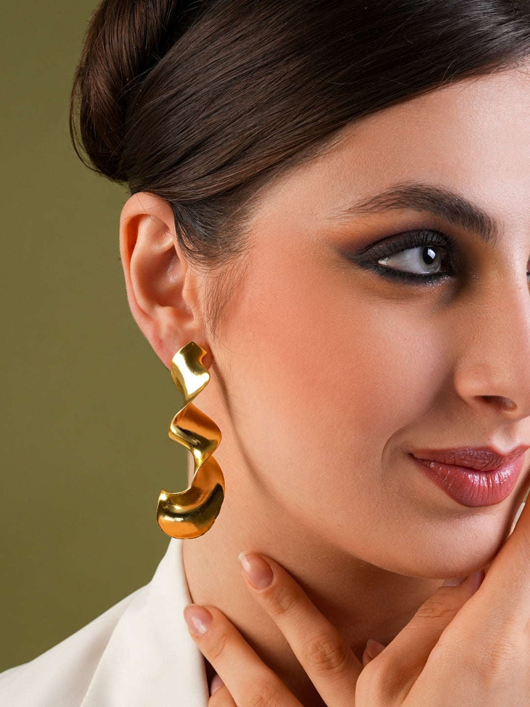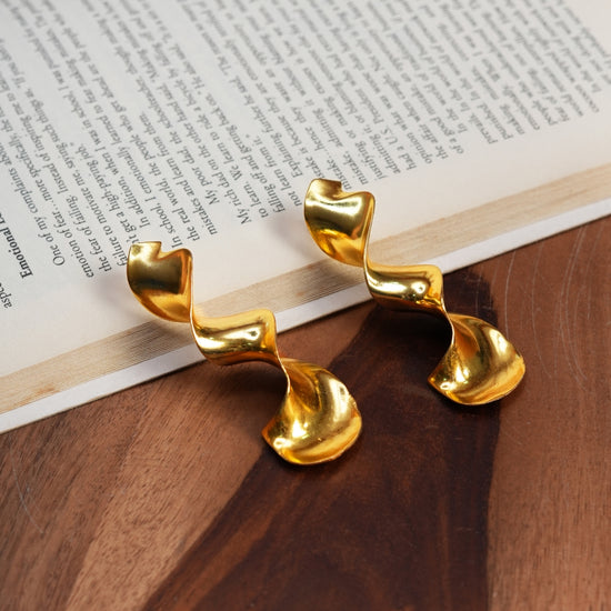 An artistic ode to movement and form, the Golden Ripple Flow Earrings capture the essence of fluidity in a sculpted twist. Handcrafted from premium brass alloy, their flowing, wave-like curves shimmer with a polished golden finish—mimicking the dance of silk caught in motion. Bold yet elegant, these earrings are perfect for statement dressing with an editorial edge.