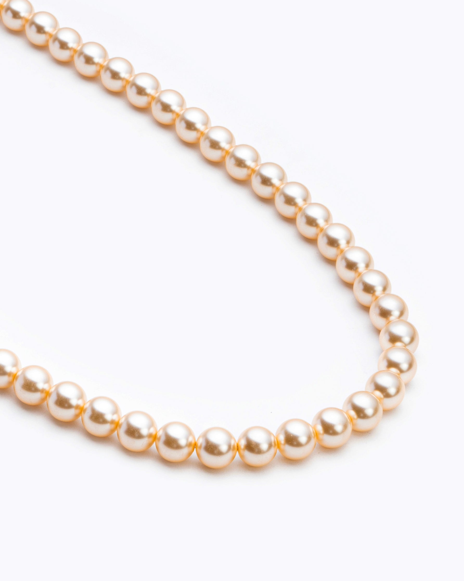 Elevate your elegance with this Gold Crystal Pearl Necklace. Designed with stunning 12mm light gold pearls, this 24-inch long necklace is a perfect blend of sophistication and charm. Its timeless design and radiant golden hue make it a versatile piece, ideal for both casual and formal settings.
