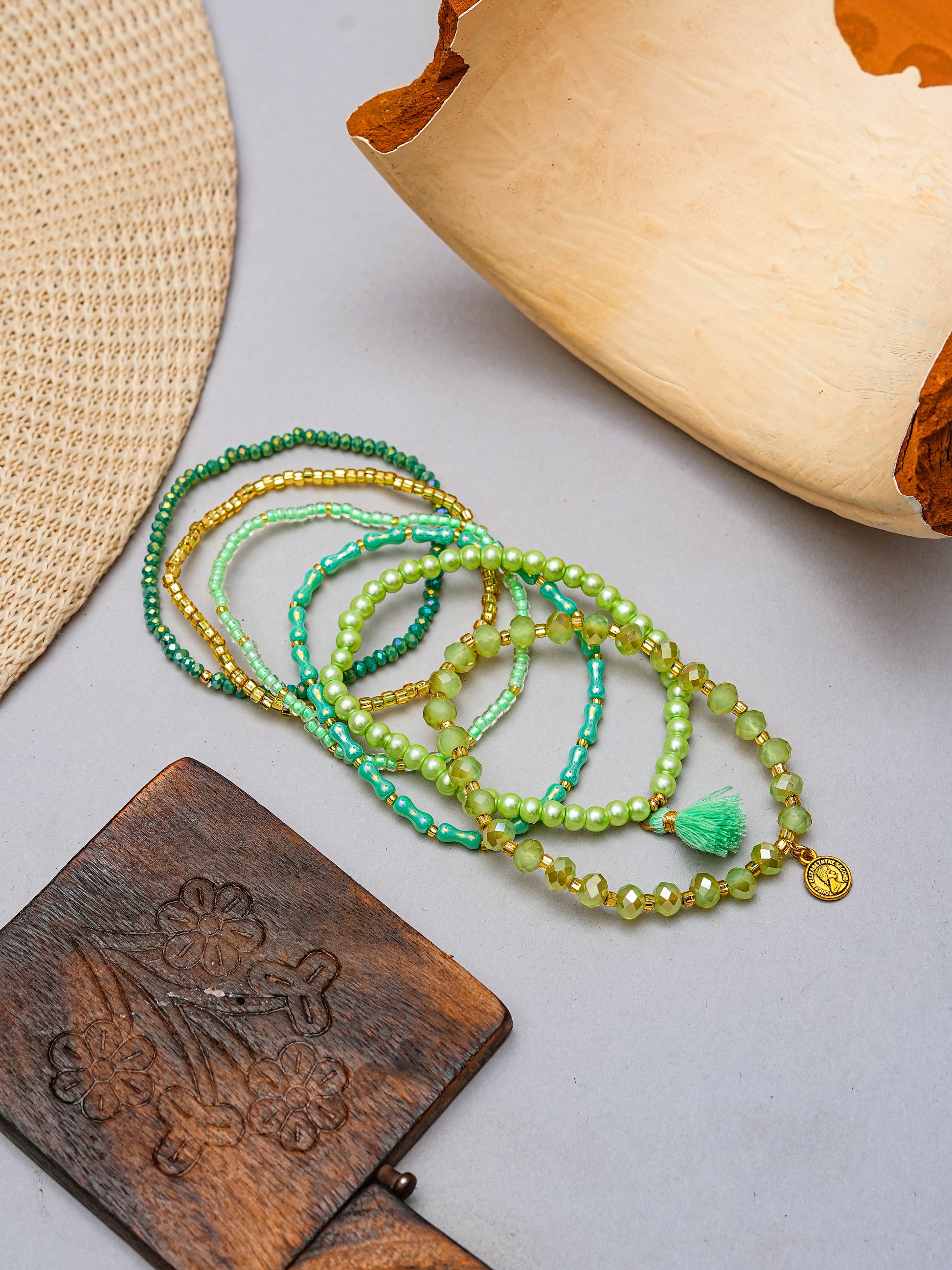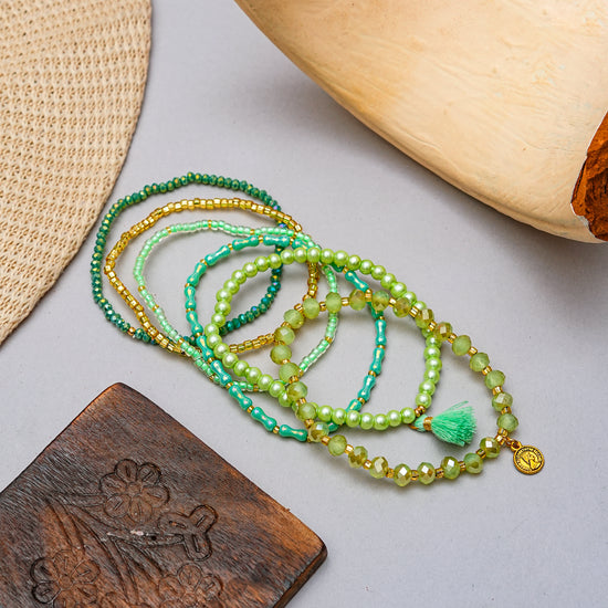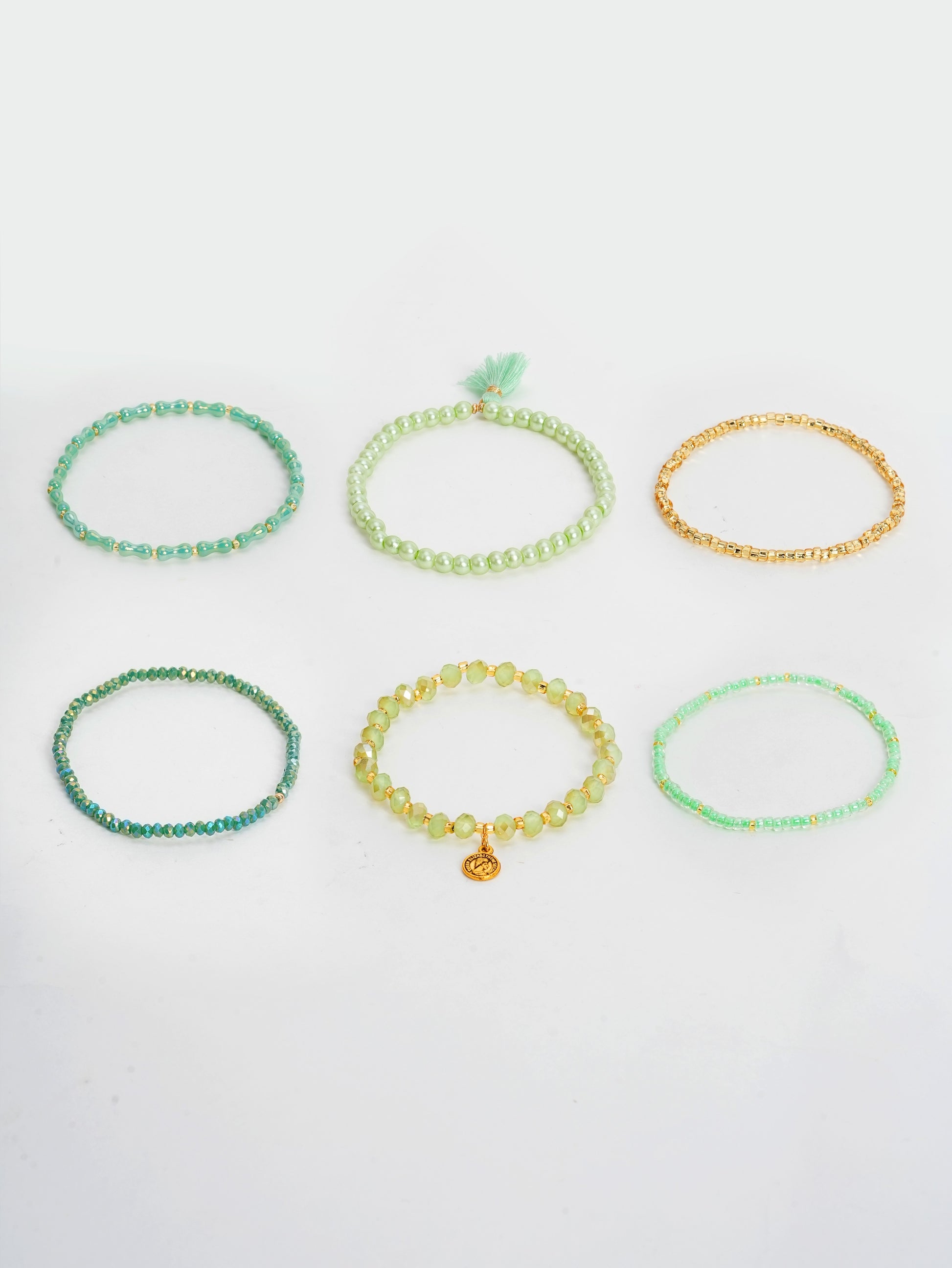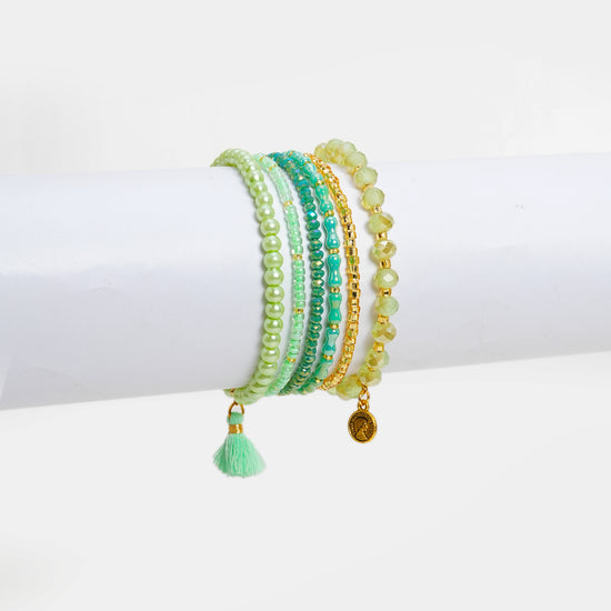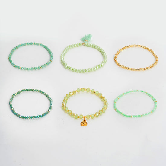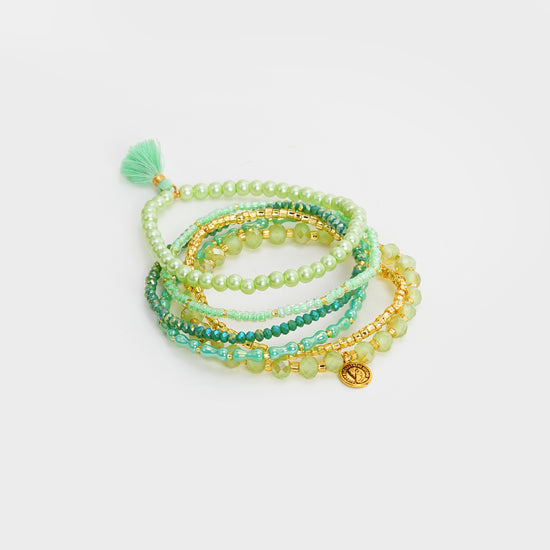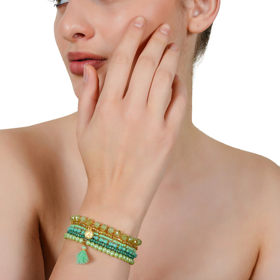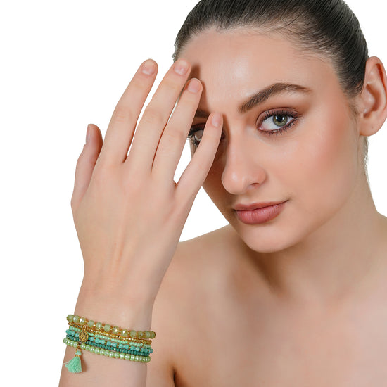 The Meadow Mint Bracelet Set is a vibrant 7-piece collection featuring mint green, aqua, and gold-toned glass beads. Designed for effortless stacking, this set includes faceted beads, gold accents, and a charming tassel and coin charm, adding a playful yet elegant touch to your accessories. Perfect for summer days, vacations, or casual chic looks.