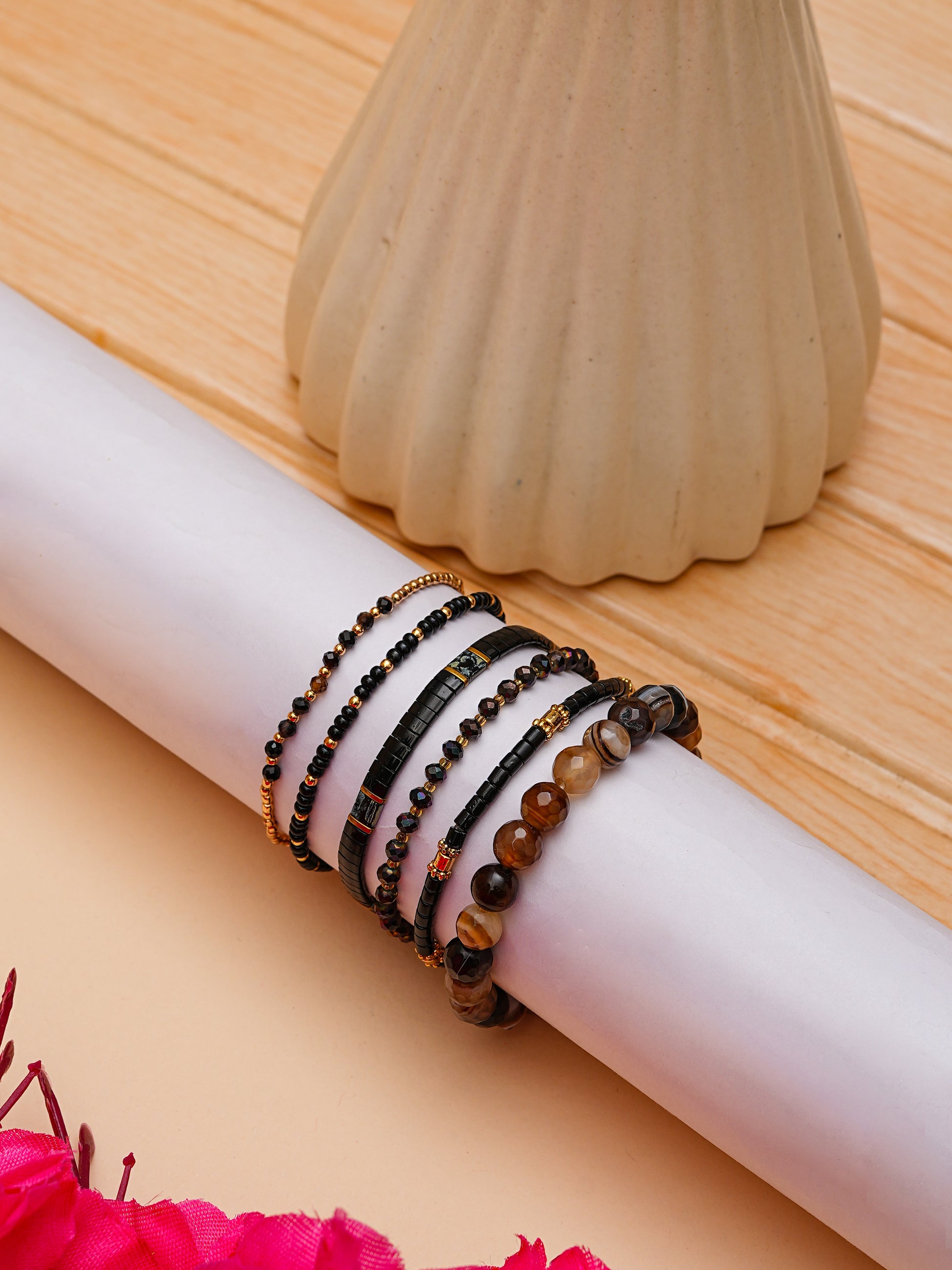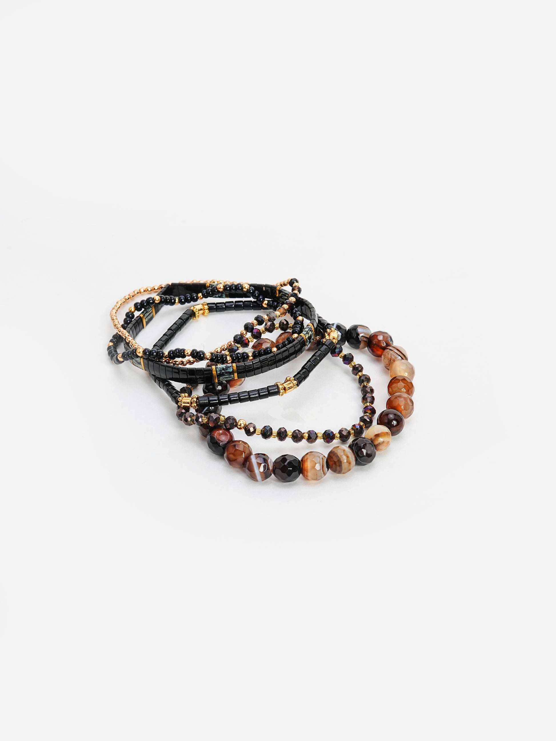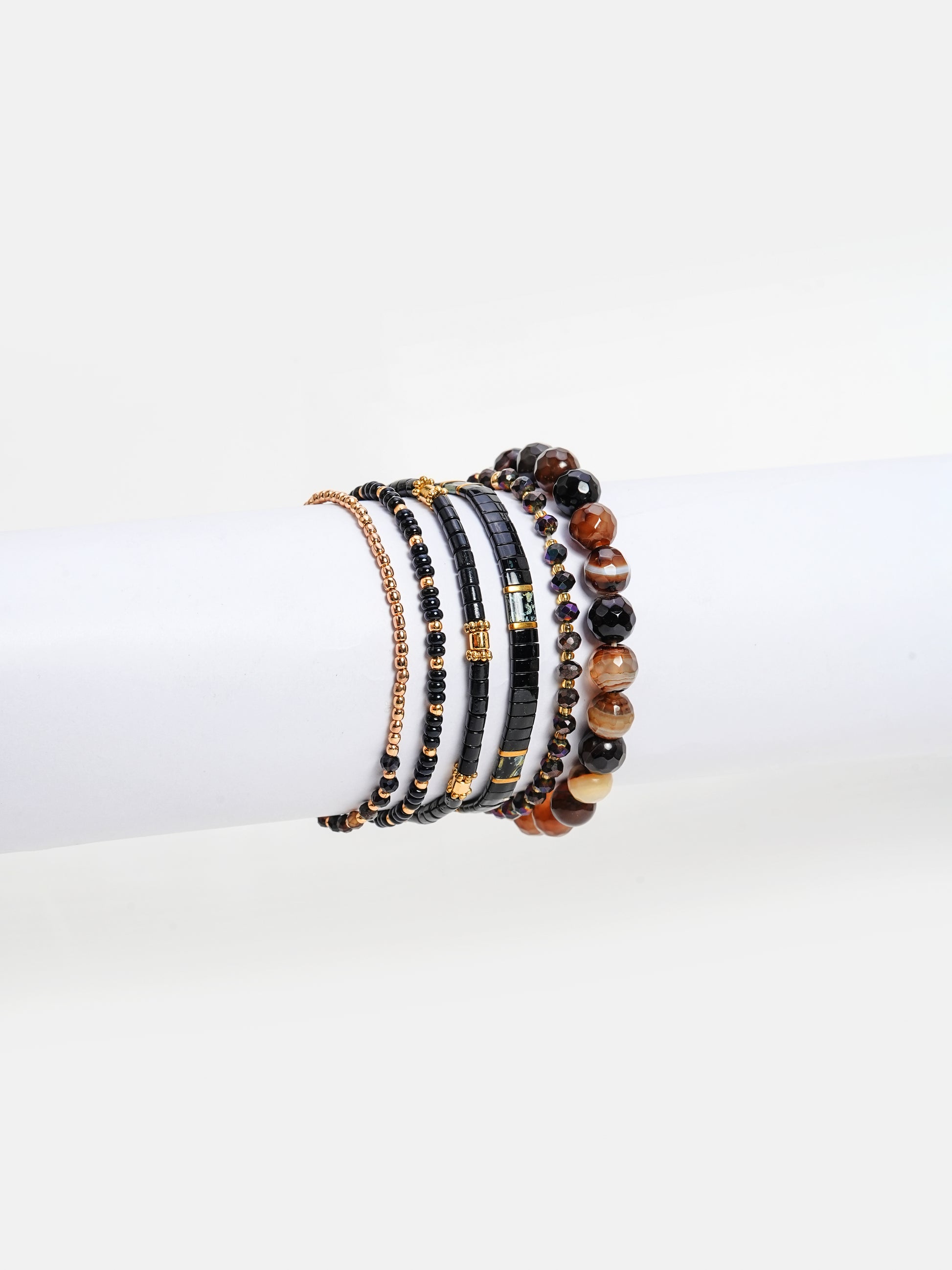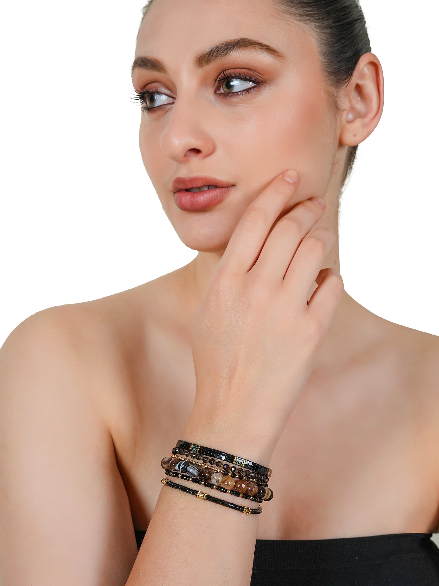 Command attention with the bold and beautifully crafted Midnight Muse Bracelet Set, a luxurious stack of bracelets designed to exude confidence and charm. This striking set features a refined mix of semi-precious agate stones, Japanese Tila beads, Mira beads, and glass beads, brought together in deep shades of black, bronze, and smoky brown. From polished elegance to boho-chic, this stack effortlessly elevates any look.