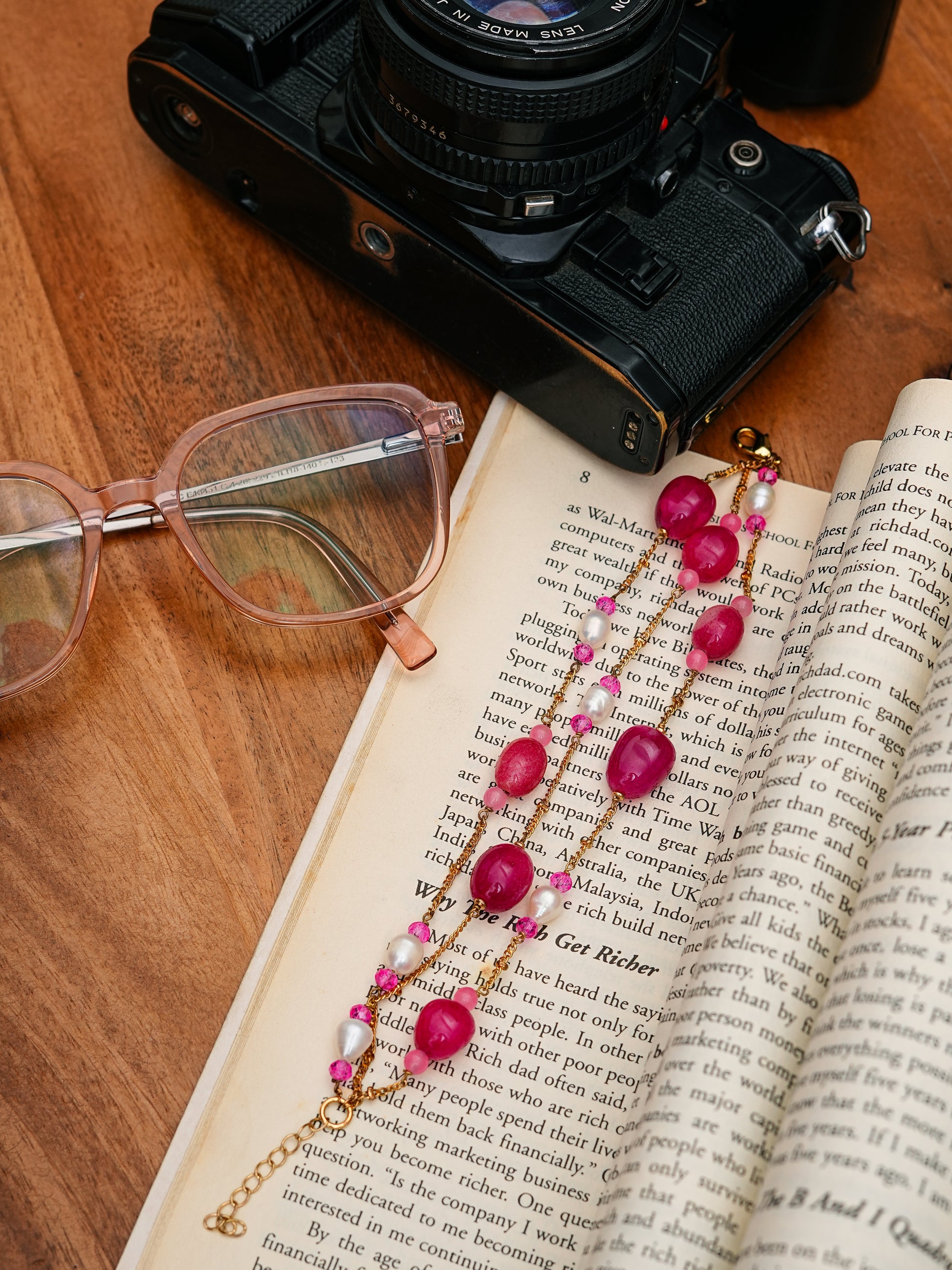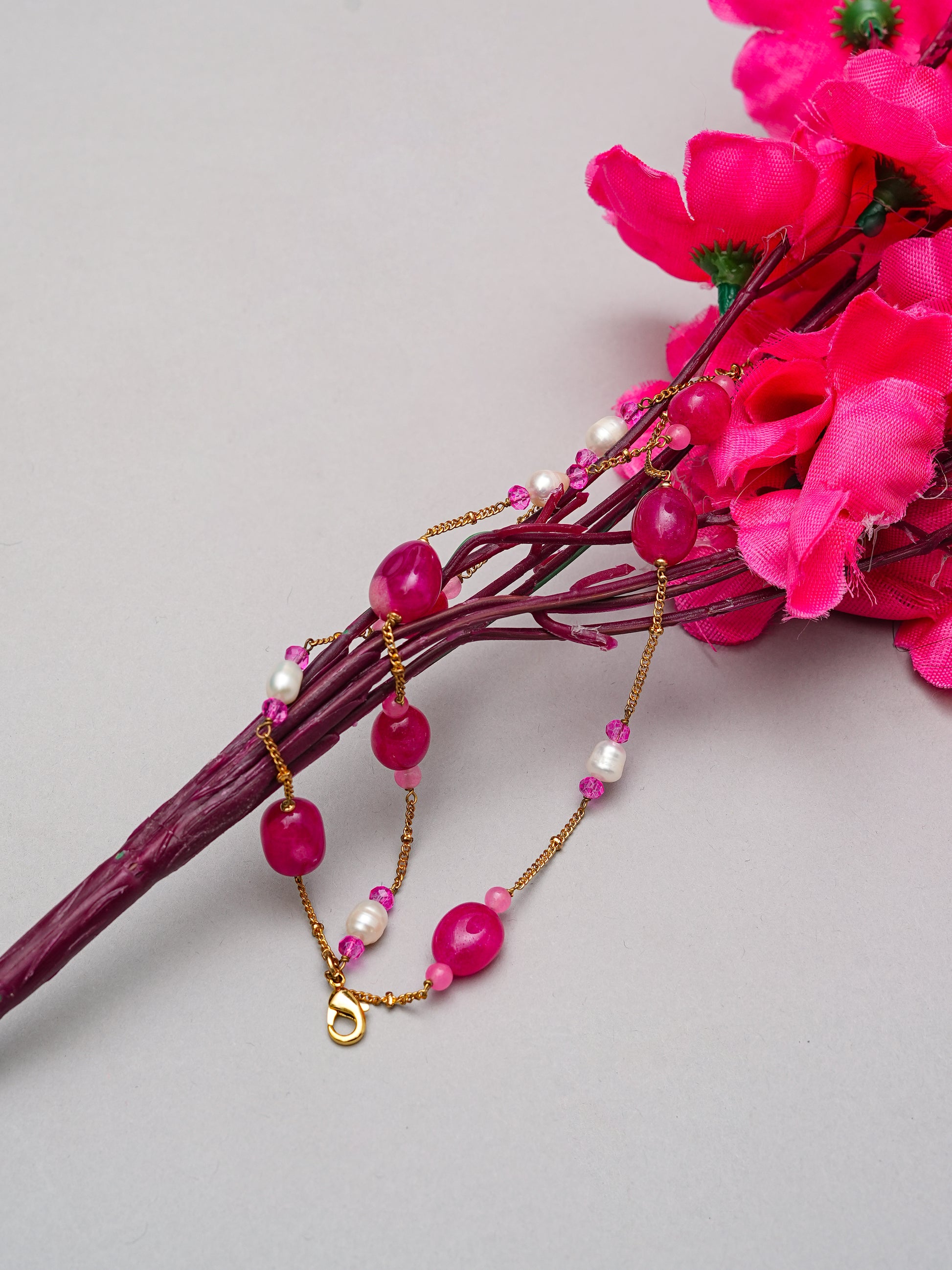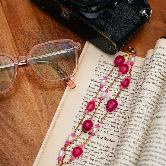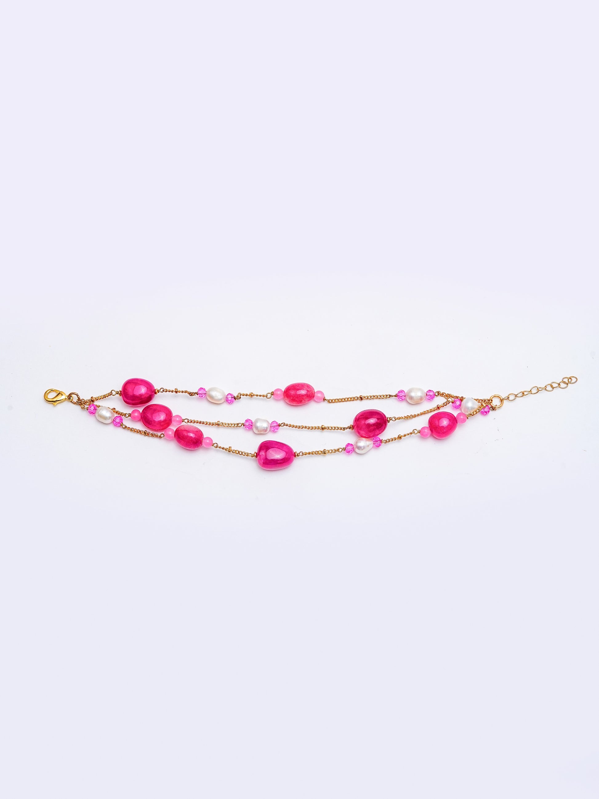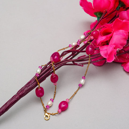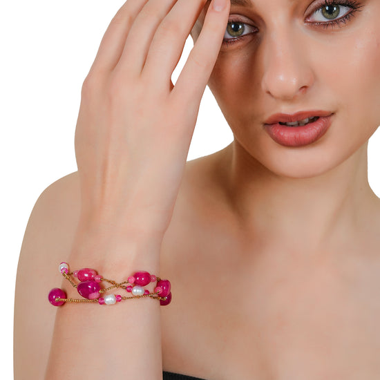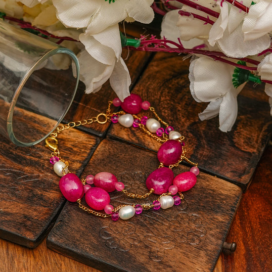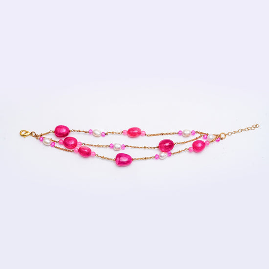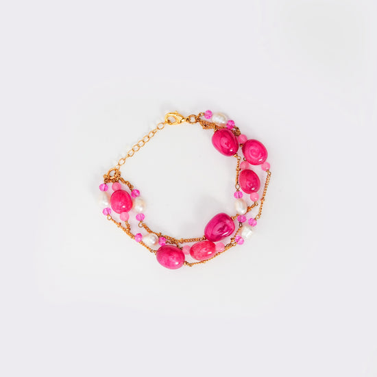 The Rosé Agate & Pearl Bracelet beautifully blends bold pink agate stones with delicate freshwater pearls. Its multi-layered design with gold-plated chains and an adjustable clasp makes it both versatile and eye-catching. Ideal for both festive and casual chic looks, this bracelet is a true statement of confidence and elegance.
