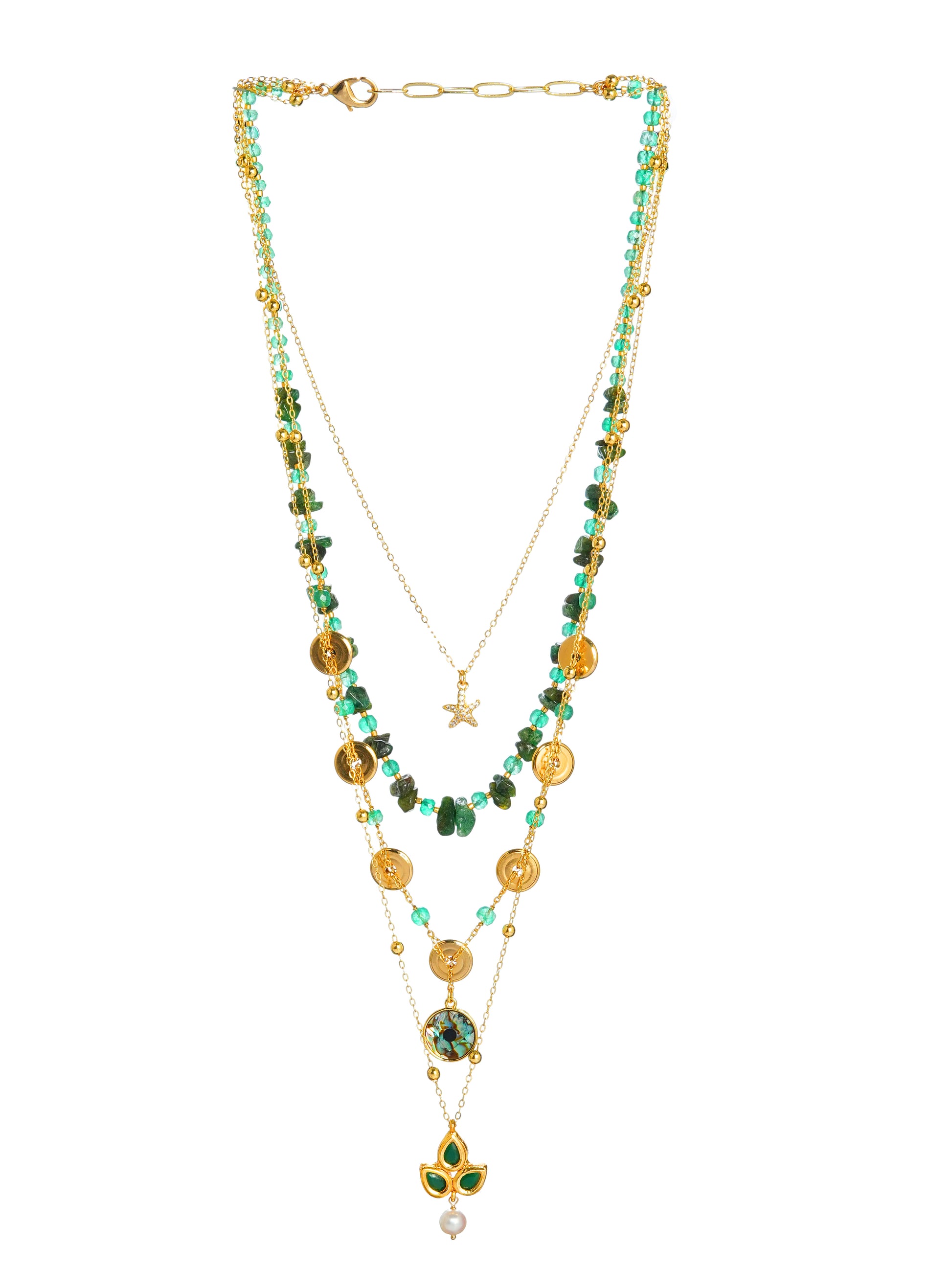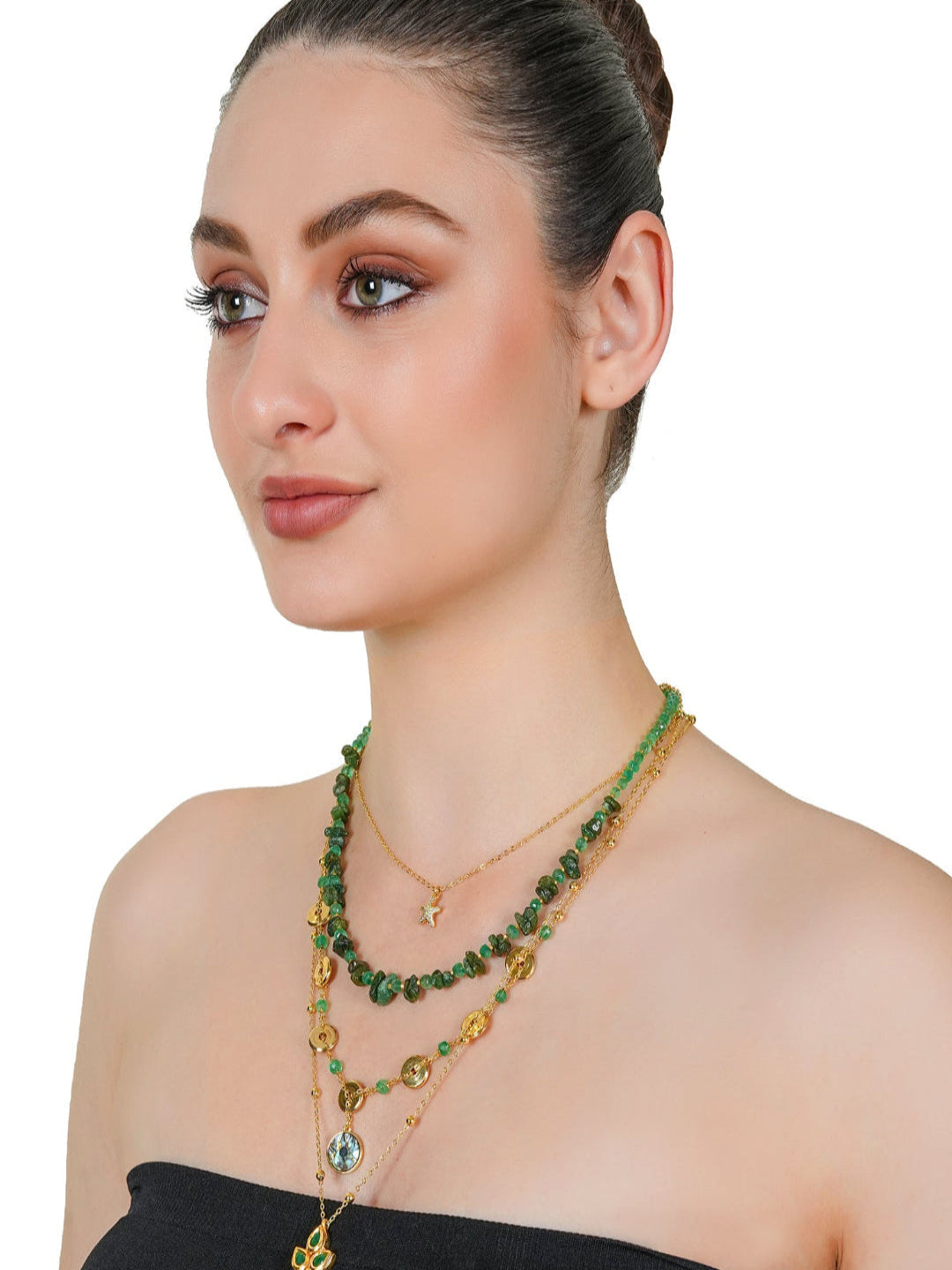 A mesmerizing blend of nature and luxury, the Seraphina Layered Necklace is designed for those who love intricate details and effortless style. Featuring a stunning combination of semi-precious green gemstones and gold-toned metal charms, this layered piece brings a touch of bohemian elegance to any outfit. The delicate coin accents, celestial motifs, and a pearl-adorned pendant add an ethereal charm, making it the perfect statement accessory for day or night.