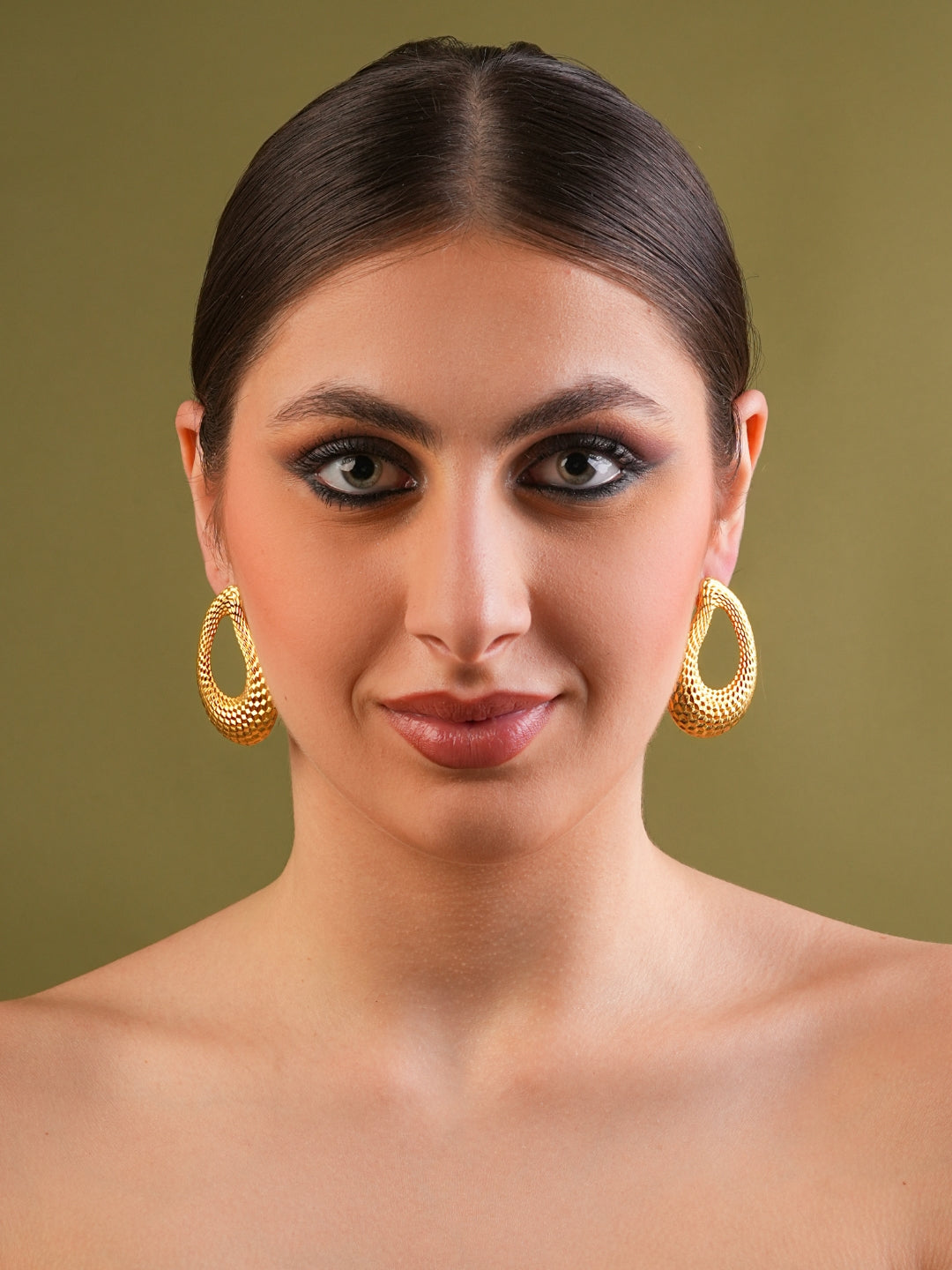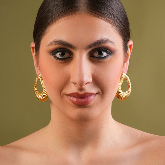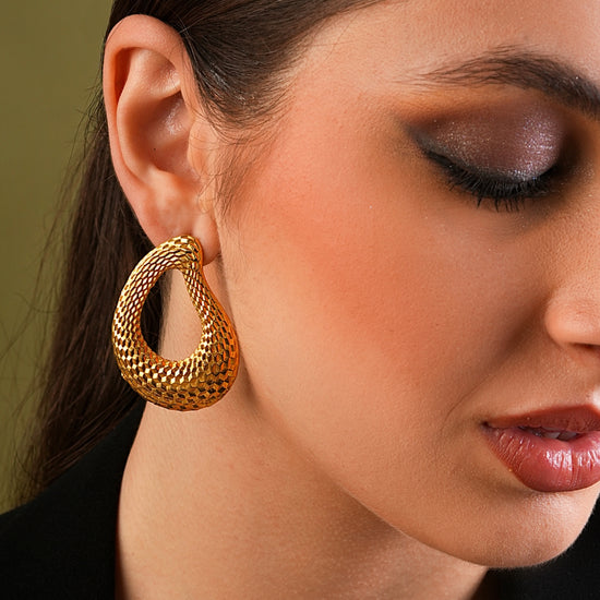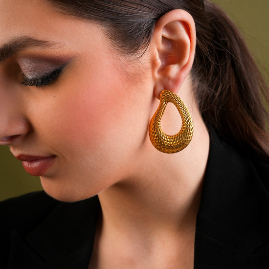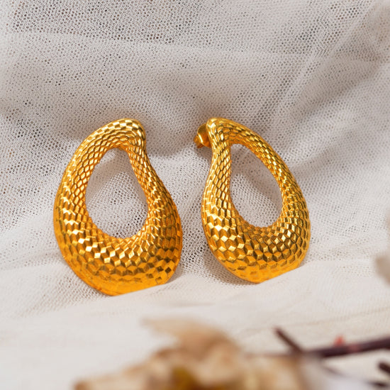 Unleash fierce elegance with these Serpent Glow Hoops, designed to mimic the textured sheen of reptilian skin in molten gold. Sculpted from premium brass alloy, the teardrop silhouette with 3D hexagonal detailing makes these earrings a bold yet timeless statement. Whether paired with a crisp saree or a structured blazer, they add edge, character, and luxury to any look.