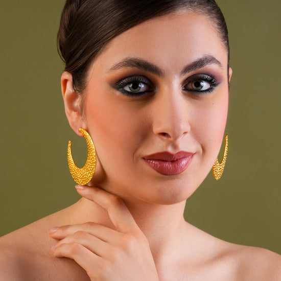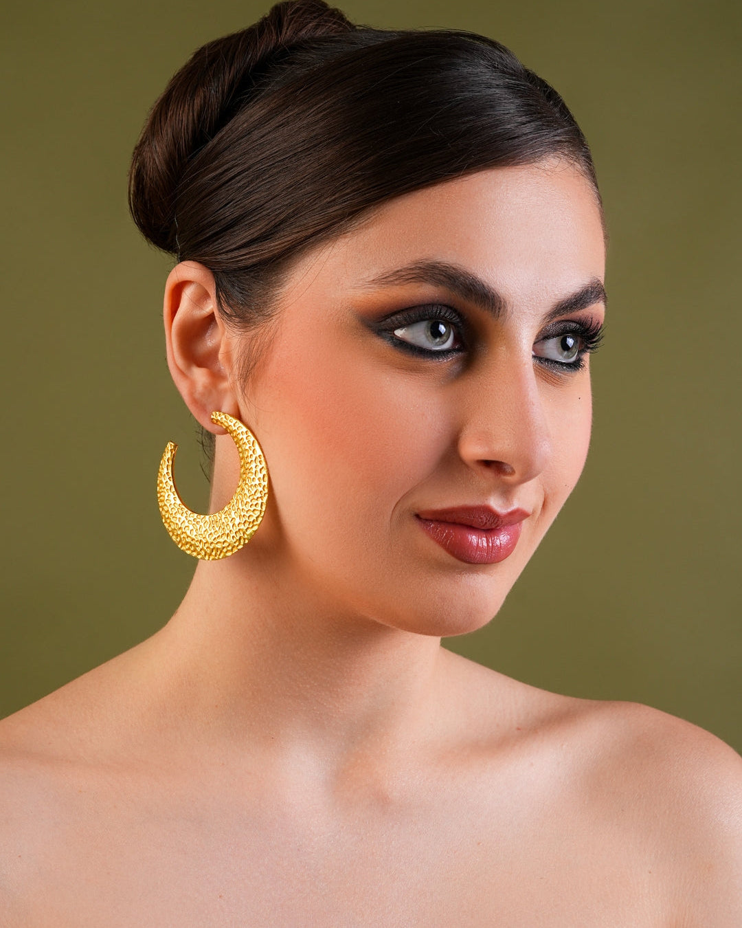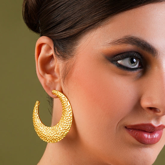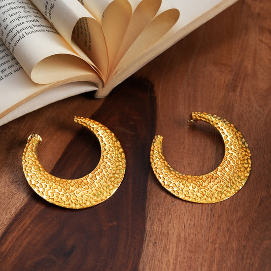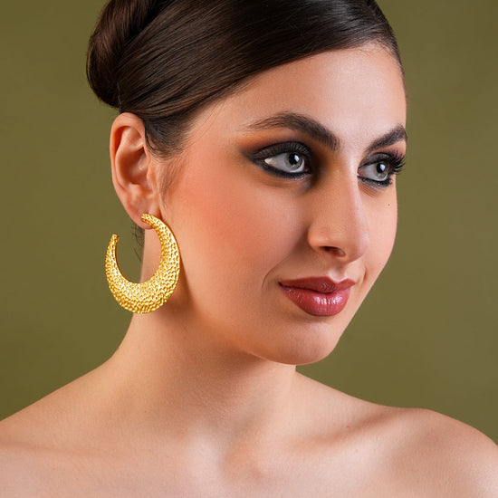 Radiating texture and timeless allure, the Sun-etched Crescent Hoops are a bold reinterpretation of classic crescent earrings. Crafted from premium brass alloy and finished in antique gold, these statement hoops feature a rich embossed pattern inspired by sun-dappled earth and hammered artistry. Lightweight yet impactful, they add just the right amount of drama to both ethnic ensembles and modern silhouettes.