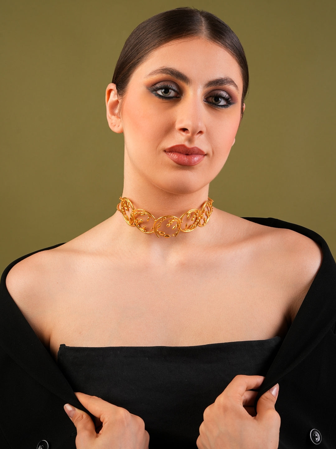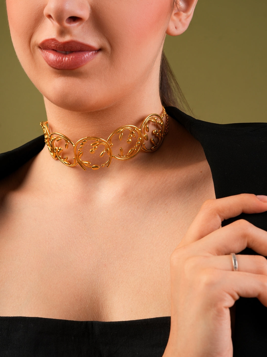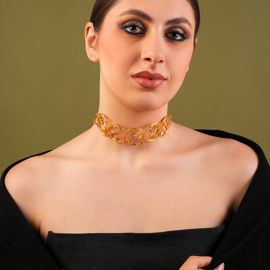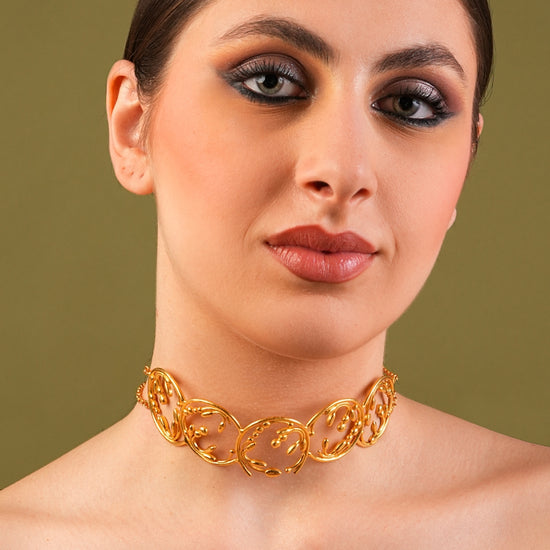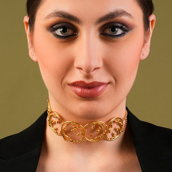 Inspired by the wild grace of nature, the Taraash Choker features delicately sculpted botanical motifs framed within a series of openwork circles. Crafted from premium brass alloy and finished in rich gold, this statement piece weaves together modern artistry with a touch of earthy elegance. Lightweight and adjustable, it's perfect for weddings, festive occasions, or adding a hint of regal charm to your everyday ensemble.