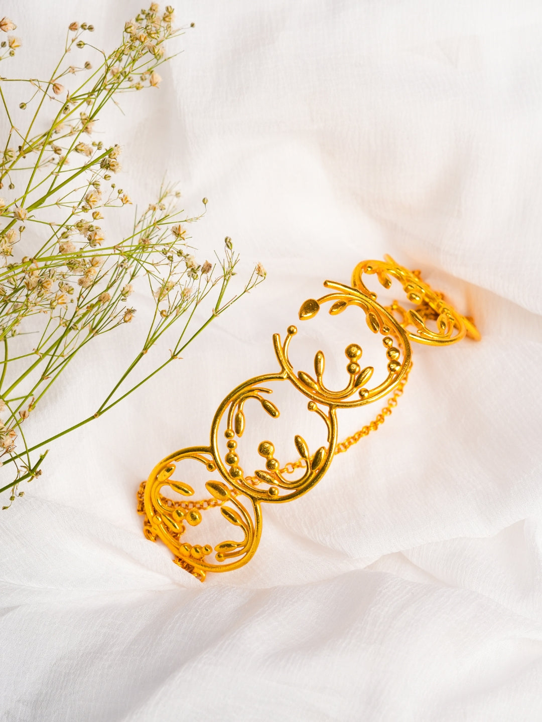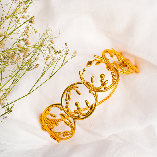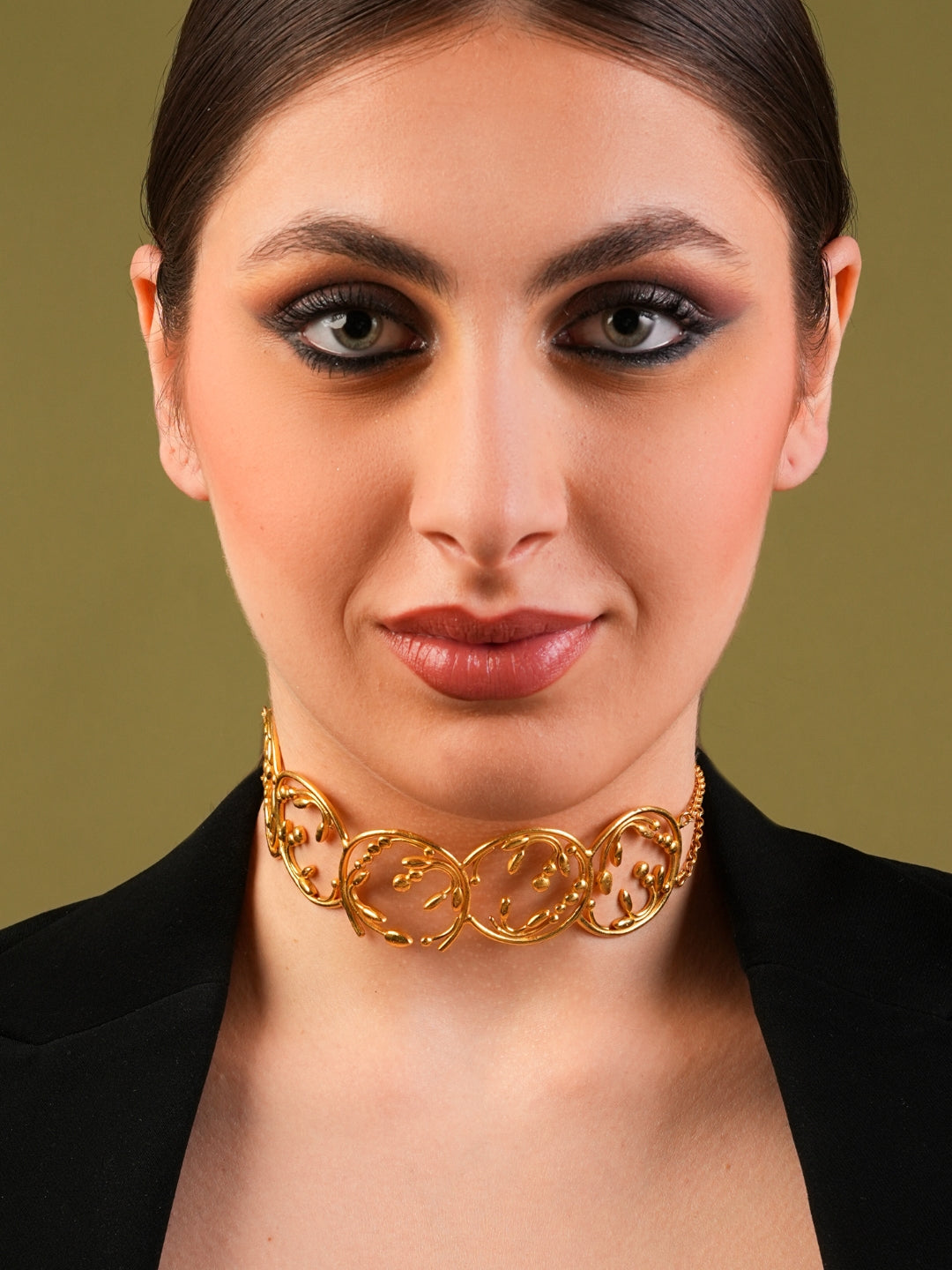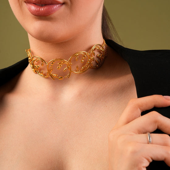 Inspired by the wild grace of nature, the Taraash Choker features delicately sculpted botanical motifs framed within a series of openwork circles. Crafted from premium brass alloy and finished in rich gold, this statement piece weaves together modern artistry with a touch of earthy elegance. Lightweight and adjustable, it's perfect for weddings, festive occasions, or adding a hint of regal charm to your everyday ensemble.